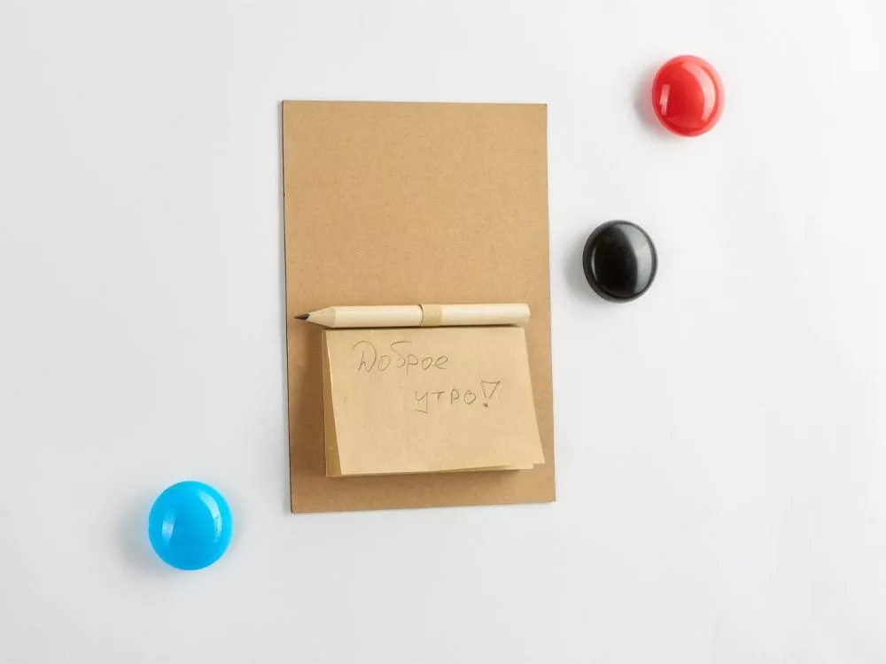 Функциональный магнит на холодильник с большим полем для нанесения логотипа и всем необходимым для заметок: в наборе идут карандаш и 40 отрывных листочков для записей. Гравировка (CO2 лазер) (Без чернения) на данный товар осуществляется бесплатно. Оплачивается только настройка оборудования в размере 1000 рублей на весь тираж.