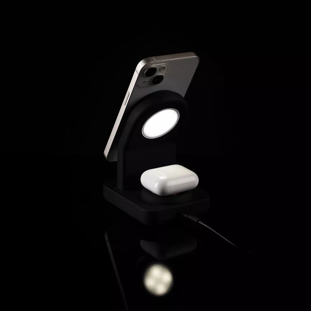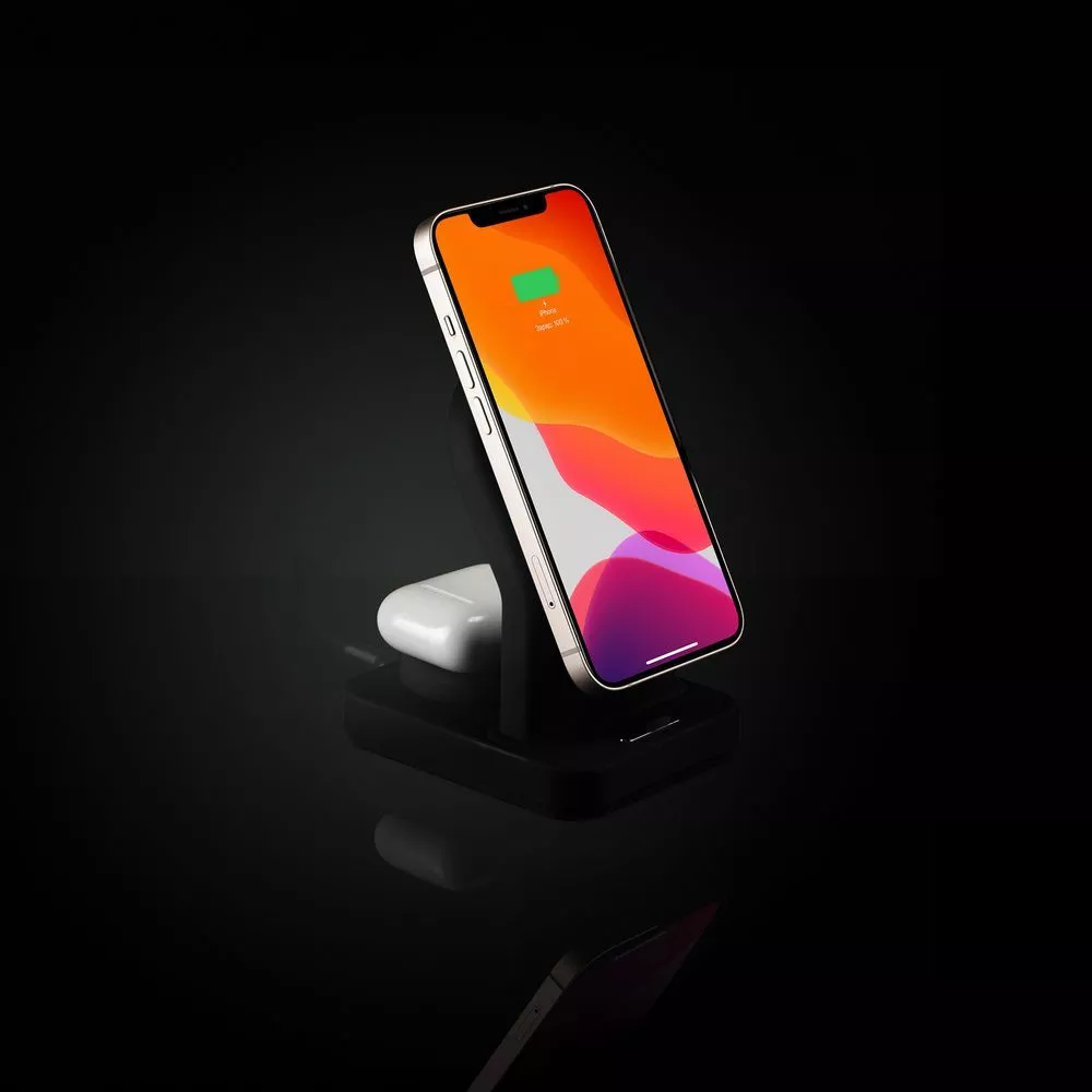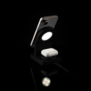 Модели iPhone 12–15 c магнитами MagSafe могут удерживаться на основной области станции. Ранние или компактные модели iPhone или смартфоны с диагональю 5,7–6" на OS Android можно оснастить специальным адаптером или чехлом со встроенным кольцевым магнитом сзади.