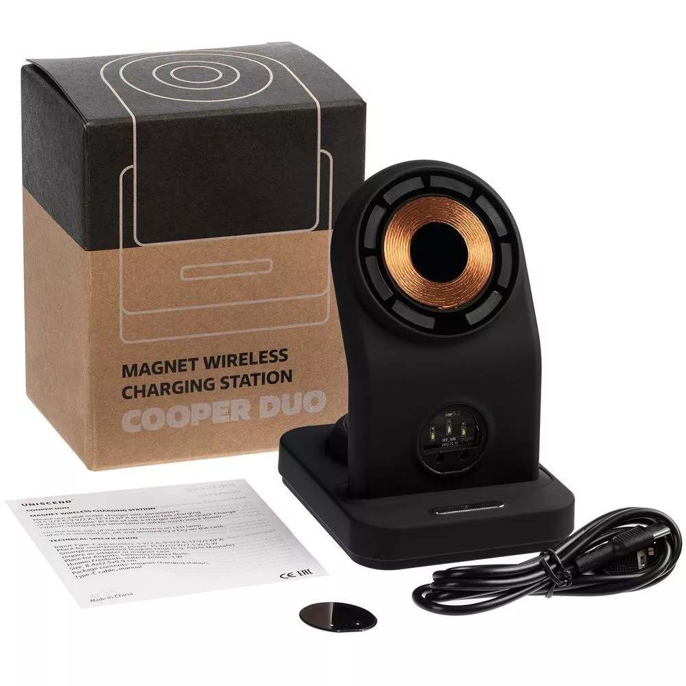 Магнитная зарядная станция Cooper Duo — это не только притягивающая взгляд электронная начинка под прозрачной панелью, но и универсальное устройство для зарядки смартфонов и наушников с поддержкой функции беспроводного заряда, в том числе моделей Samsung и Huawei. Станция имеет отключаемую подсветку окружающего пространства сзади и небольшую круглую область с подсветкой спереди— чтобы логотип, нанесеный методом лазерной гравировки, выглядел более эффектно. Стекло для гравировки логотипа с двухсторонним скотчем на задней поверхности в комлекте.