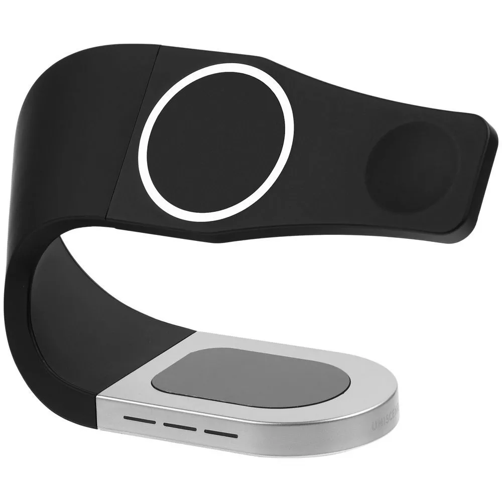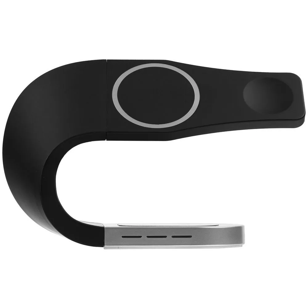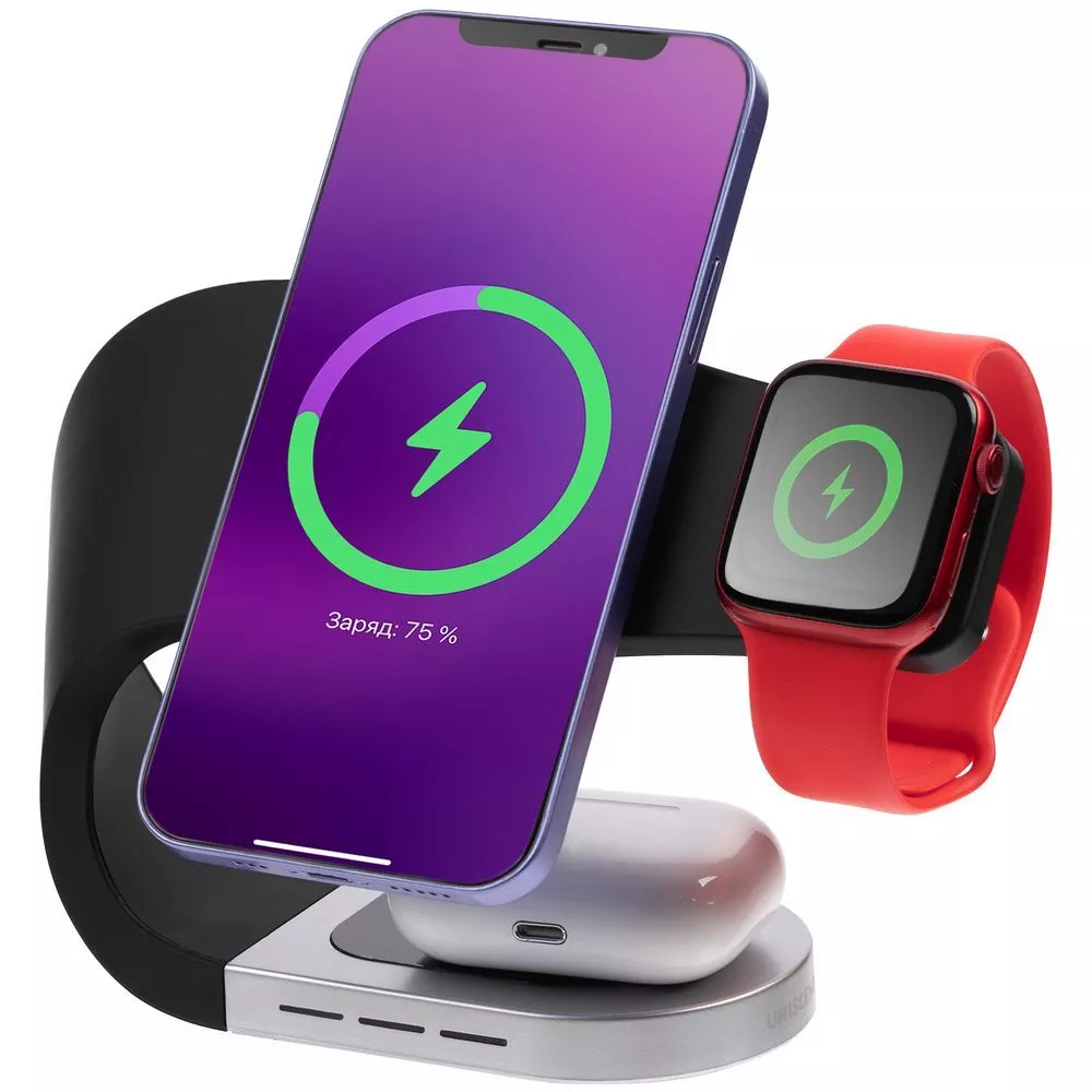 Магнитная зарядная станция может заряжать одновременно 4 устройства: беспроводные наушники, смартфон, часы Apple Watch (1-6) и еще одно любое устройство с помощью USB-кабеля.