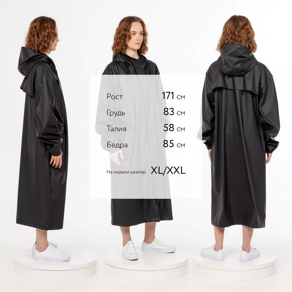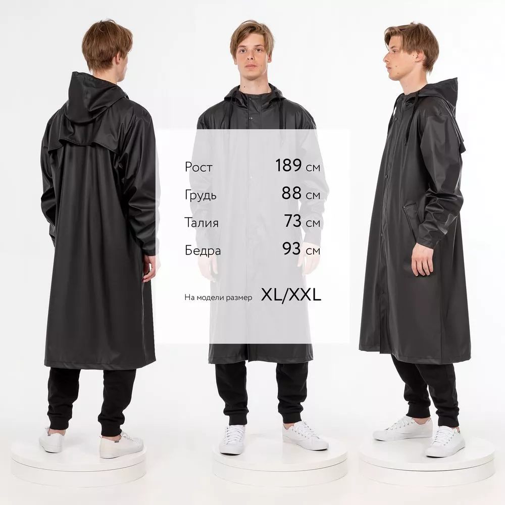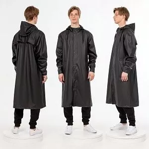 Плащ-дождевик с капюшоном из полиэстера с полиуретановым непромокаемым покрытием.