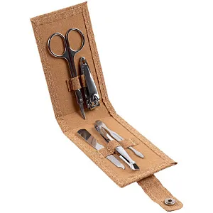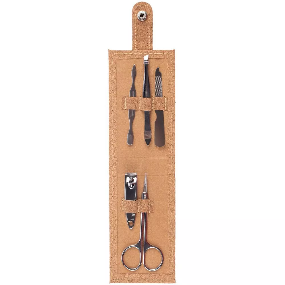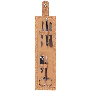 Набор для маникюра в футляре из пробки с 5 инструментами из нержавеющей стали: пилкой, ножницами, кусачками для ногтей, пинцетом и лопаткой для кутикулы.