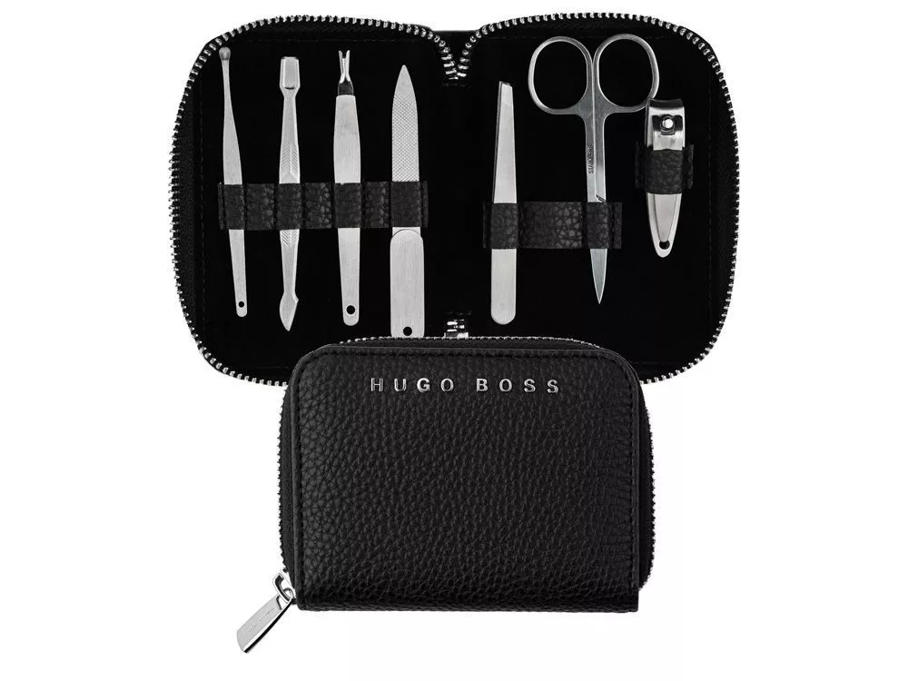 Футляр набора для маникюра Storyline выполнен из мягкой эко кожи с зернистой текстурой и украшен красивым хромированным логотипом HUGO BOSS. Футляр застегивается на молнию с логотипом HUGO BOSS. Благодаря компактному размеру набор удобно брать с собой в поездки и путешествия. В набор входит всё самое необходимое: пилочка для ногтей, ножницы, пинцет, ножницы для стрижки ногтей, палочка для чистки ушей, лопатка и триммер для удаления кутикулы.