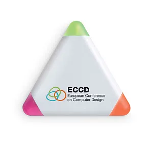 Трехцветный пластиковый маркер-выделитель, треугольный корпус. Цвета маркера: желтый, розовый и оранжевый.