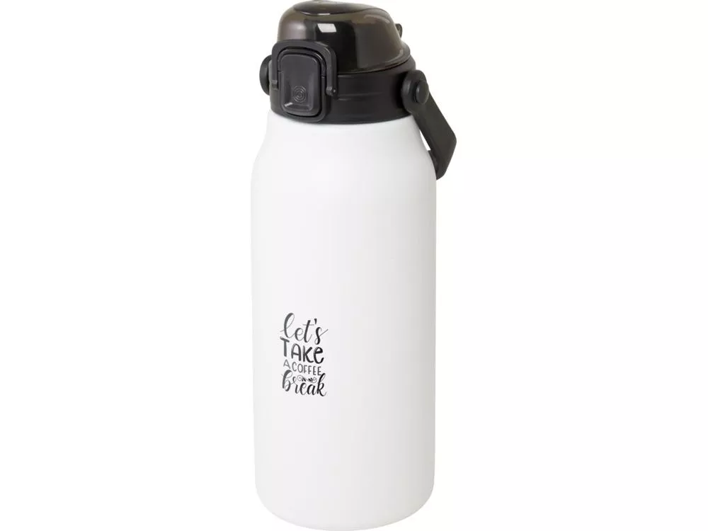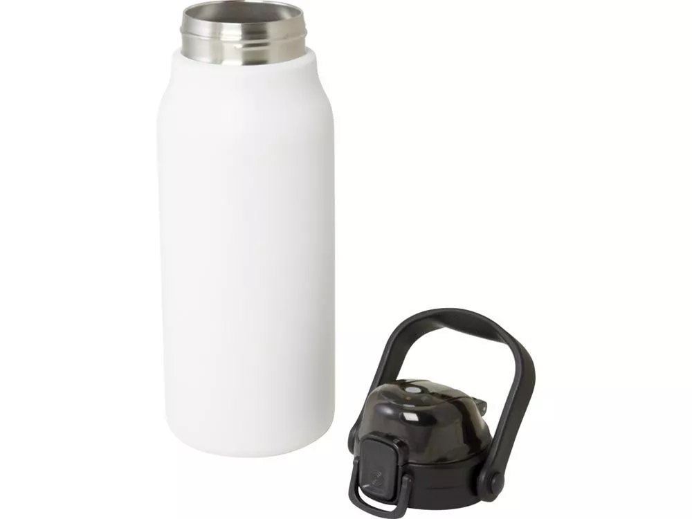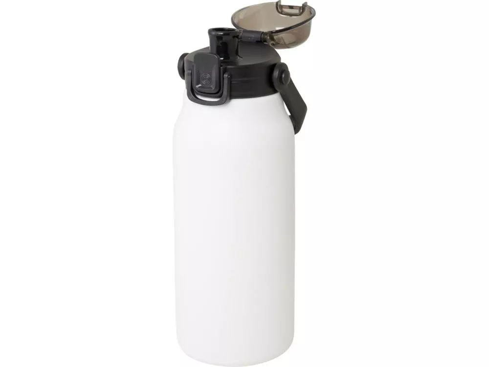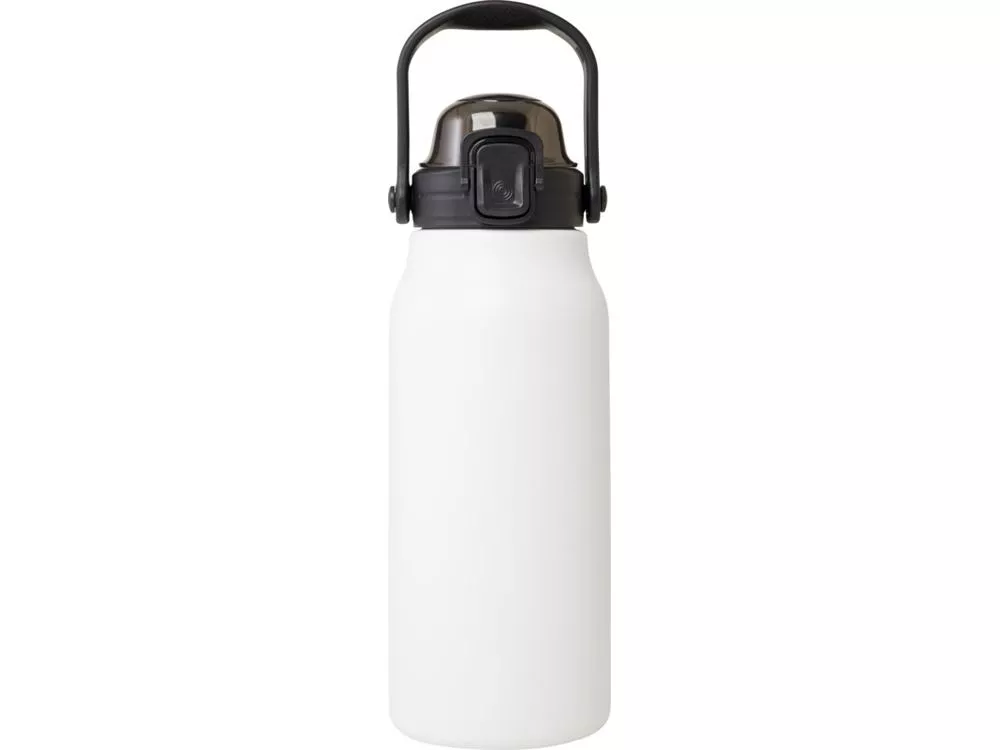 Эта большая бутылка из переработанной нержавеющей стали, сертифицированной RCS, позволит вам поддерживать водный баланс в течение дня и оставаться стильным. Медная вакуумная изоляция сохранит напитки горячими или холодными в течение нескольких часов, а благодаря складной ручке ее легко переносить. Бутылка герметична и имеет удобный механизм открывания с помощью кнопки. Объем составляет 1600 мл. Поставляется в подарочной коробке из переработанного картона. Recycled stainless steel, Recycled PP Plastic. Packaging: FSC Mix Credit P5.1 CU-COC-877277.