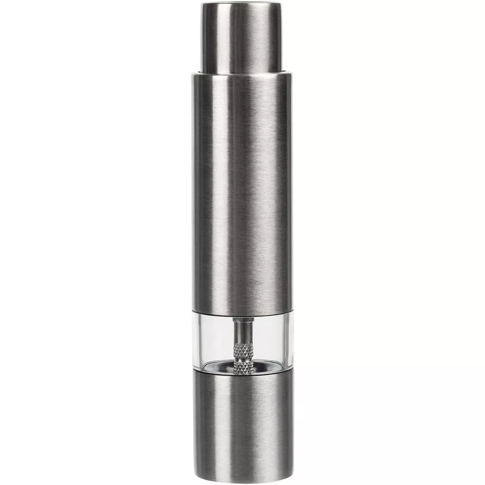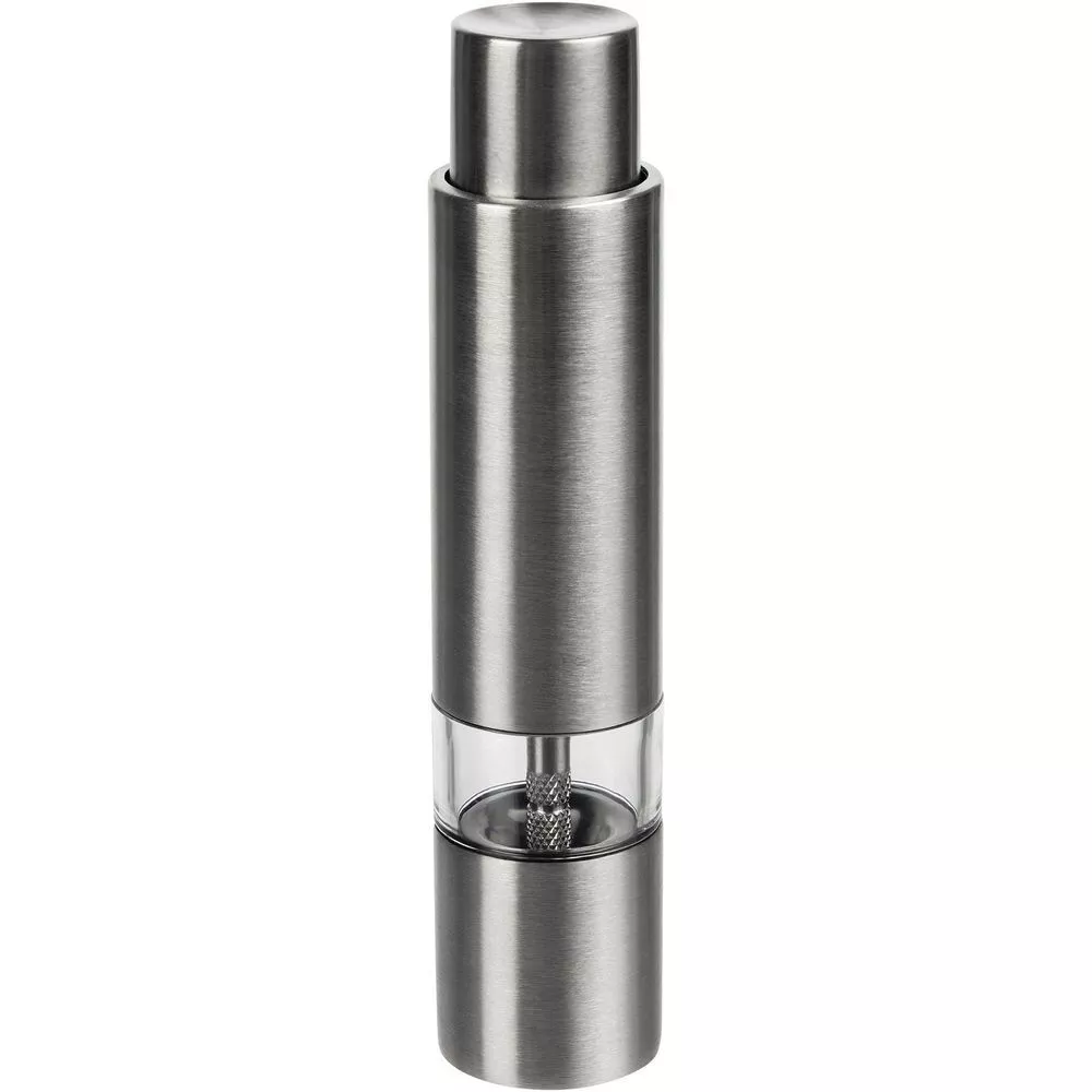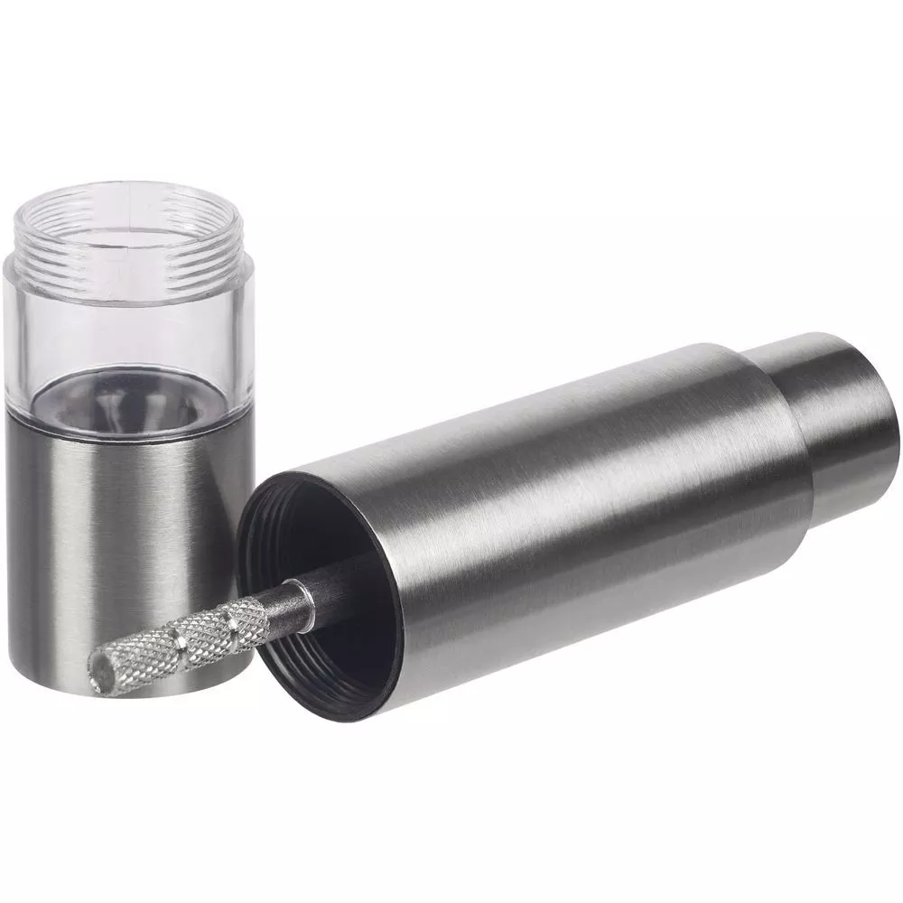 Компактная ручная мельница с пружинным механизмом и металлическими жерновами.