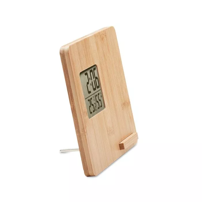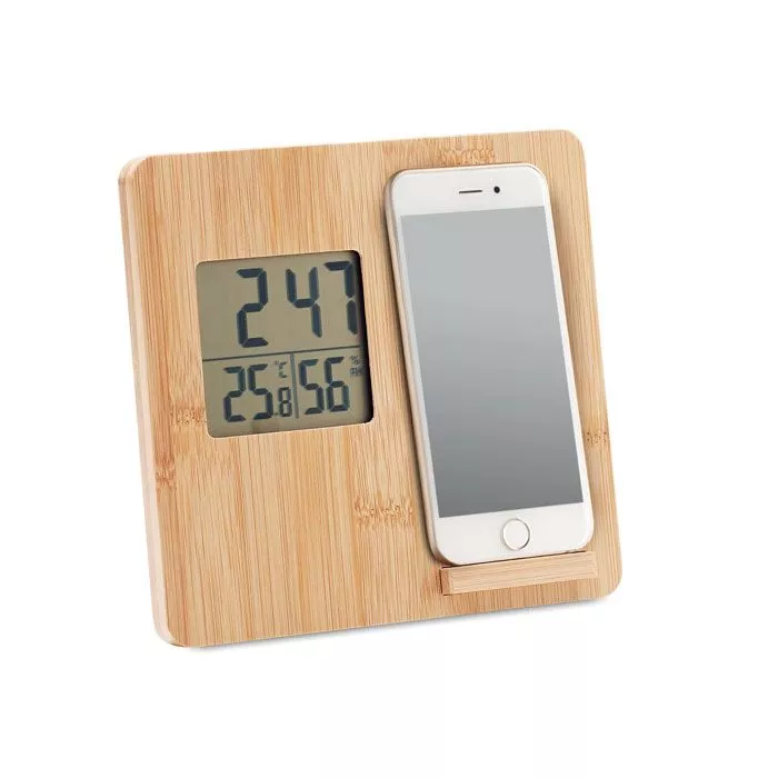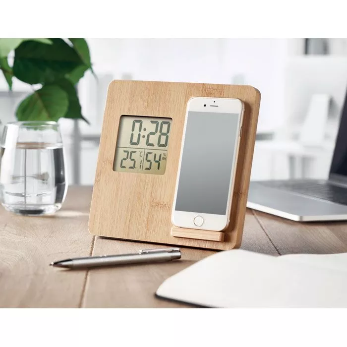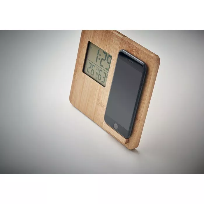 Беспроводное зарядное устройство мощностью 10 Вт с индикацией времени, температуры и влажности, функцией подставки для смартфона в бамбуковом корпусе. Батарейка CR2032 в комплекте. Беспроводной выход: DC 9V/1.10A (10W) для быстрой зарядки. Совместимость с последними моделями андроидов, iPhone® 8, X и новее.