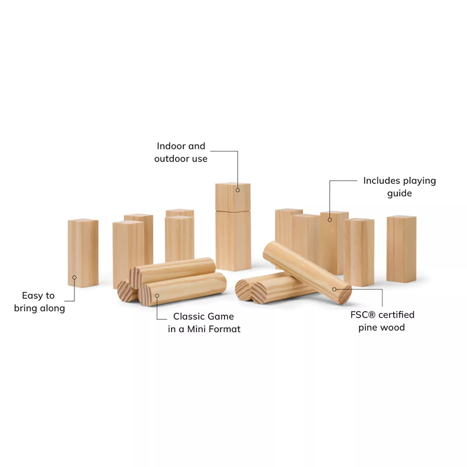 Мини-игра «Кубб» — идеальное развлечение на свежем воздухе в компании друзей или коллег. Иногда её называют «Шведскими городками», так как она происходит с острова Готланд, Швеция. Мини-версия отличается только размером, поэтому ее легко брать с собой на пляж или пикник. В наборе: один король, десять кубов и шесть метательных кеглей из сертифицированной FSC® древесины сосны. Цель игры — сбить пять кубов противника, а затем свергнуть короля, чтобы выиграть партию. Игра упакована в холщовую сумку с сетчатой задней стенкой, что позволяет легко носить ее с собой. Инструкция с правилами в комплекте.