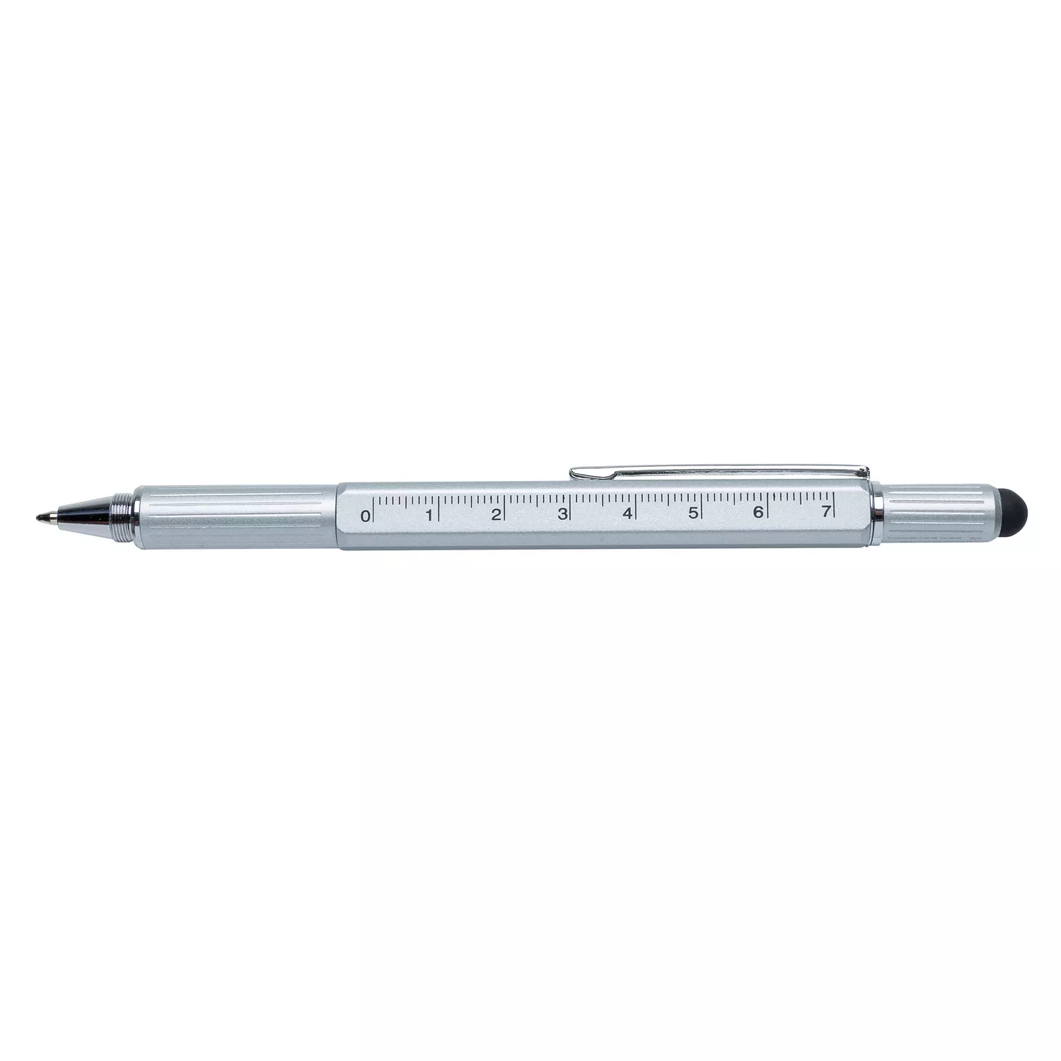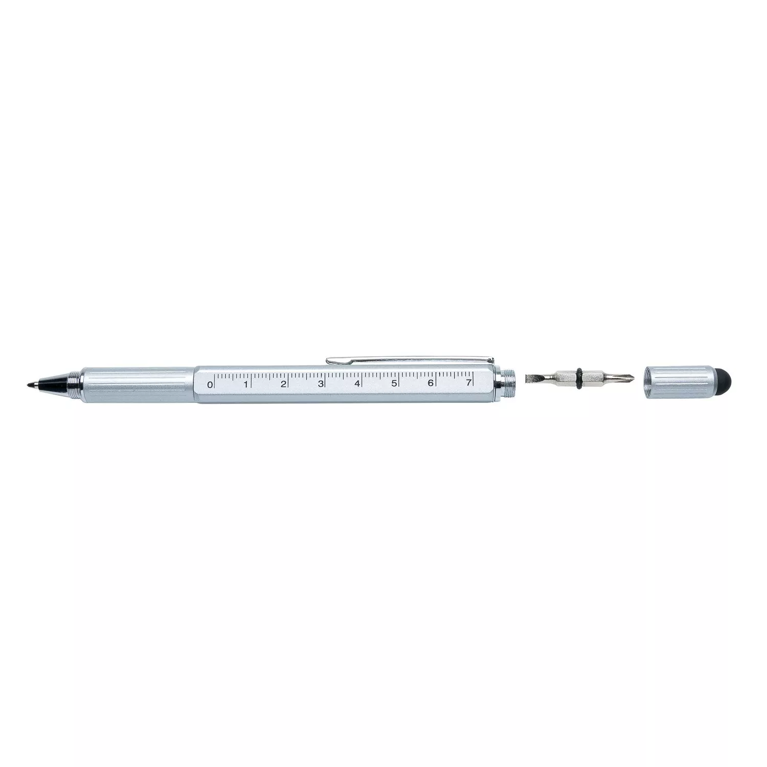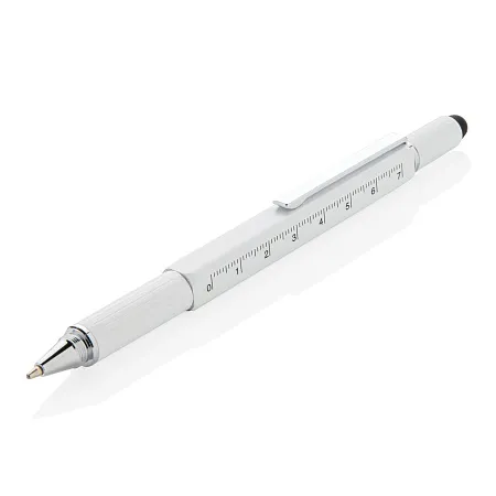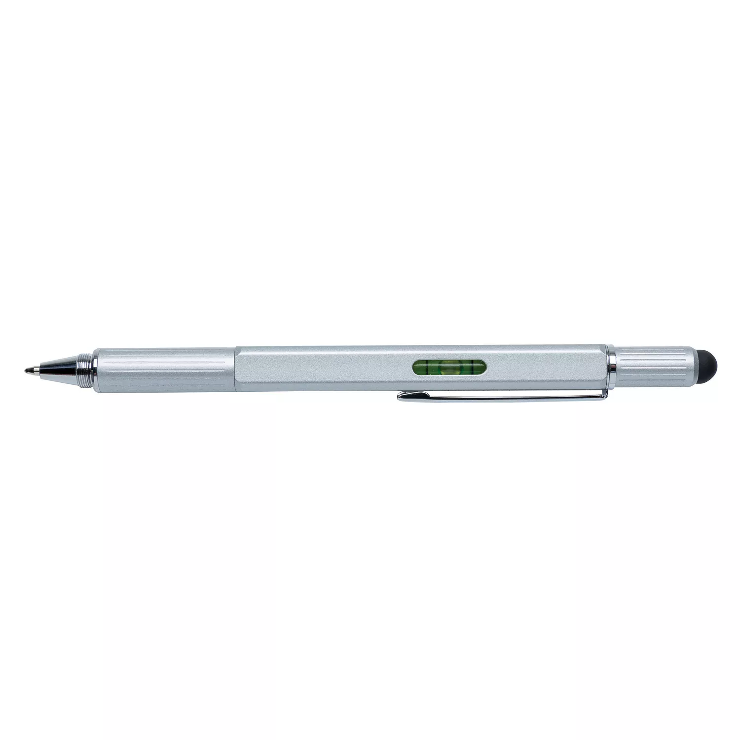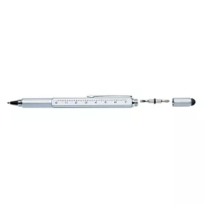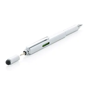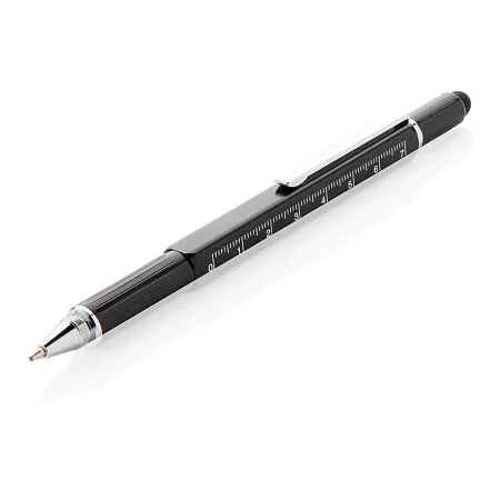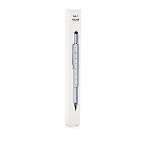 Многофункциональная ручка совмещает в себе линейку длиной 7см, спиртовой уровень, отвертку, стилус и синюю шариковую ручку, чернил в стержне которой хватит на линию длиной до 400м. Корпус ручки изготовлен из высококачественной латуни и дополнен удобным алюминиевым клипом.