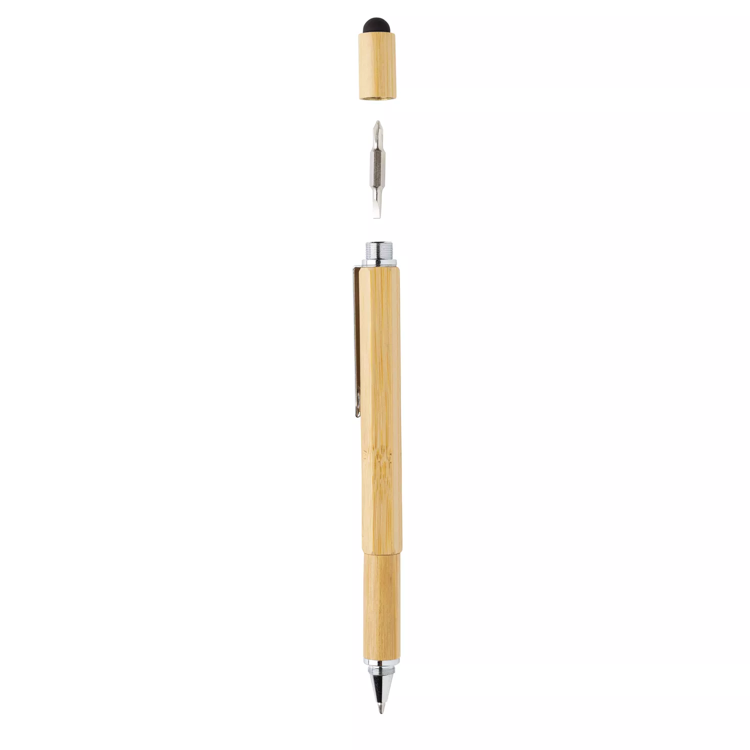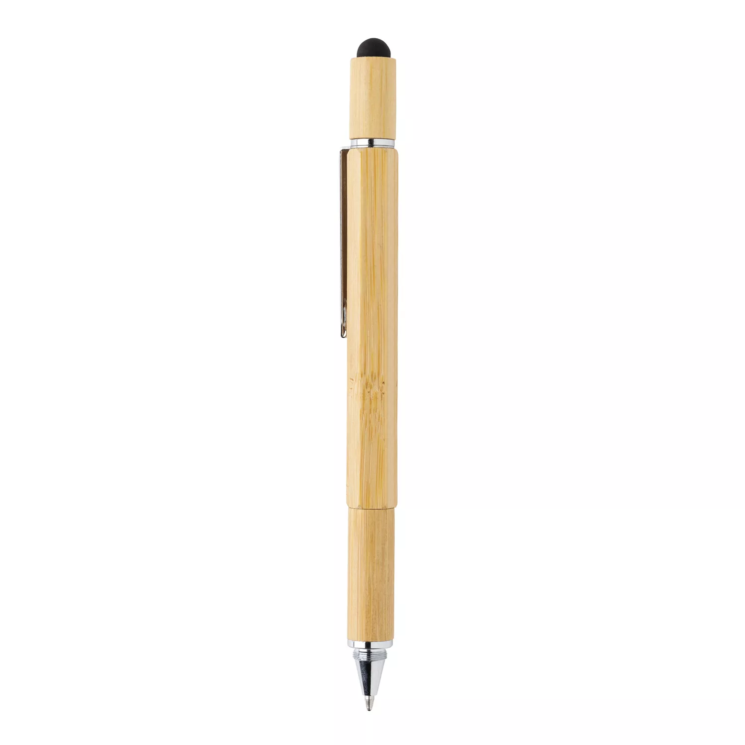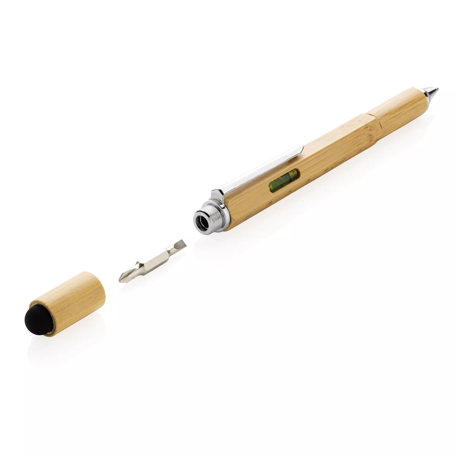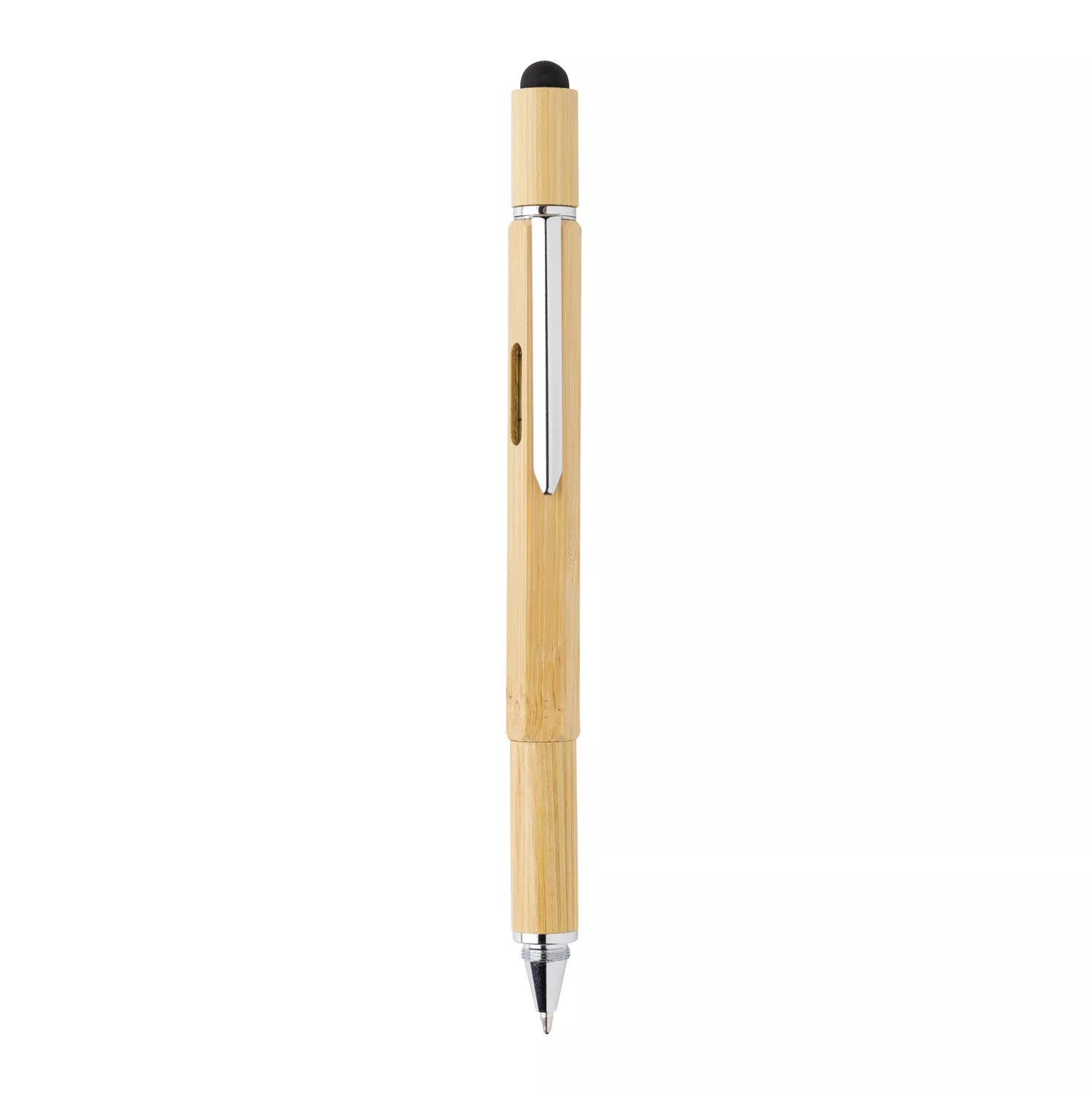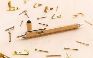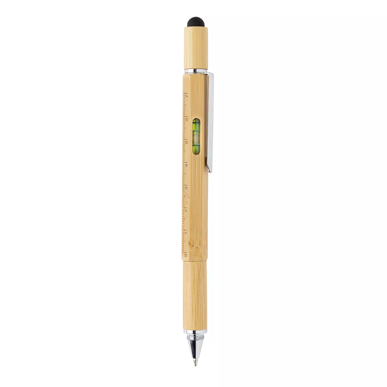 Многофункциональная ручка из натурального бамбука с линейкой (7 см), спиртовым уровнем, отверткой, стилусом и синими чернилами (способна прочертить линию до 400 м). Изготовлена из бамбука с алюминиевым клипом.