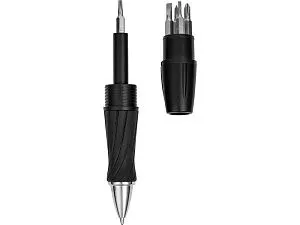 Инструмент Joker 7-в-1 с ручкой и фонариком. Шариковая ручка с поворотным механизмом, корпус- холдер для 5-ти насадок отверток. Светодиодный фонарик с поворотным включением. Батарейки в комплекте. АБС пластик. Тампопечать (1 цвет (цветные изделия)) на данный товар осуществляется бесплатно. Оплачивается только настройка оборудования в размере 3600 рублей на весь тираж.