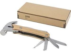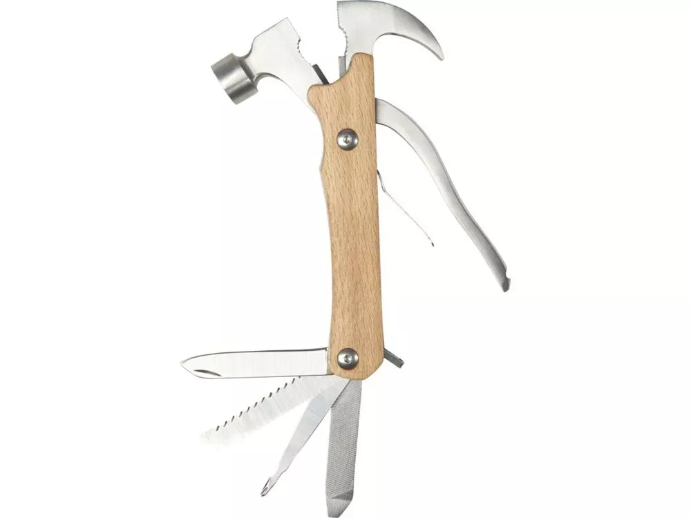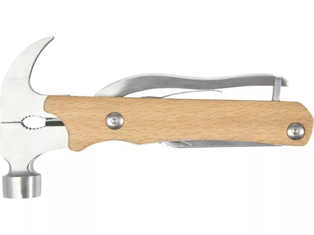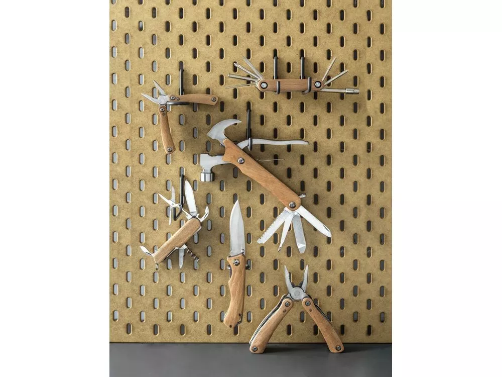 Прочный, долговечный и компактный многофункциональный инструмент из качественной нержавеющей стали с ручками из буковой древесины. Обязательный аксессуар для любого скаута, мастера и других любителей выживания или активного отдыха. Используемая буковая древесина поступает от надежных поставщиков, соблюдающих все экологические и социальные нормы. Размер этого многофункционального инструмента в открытом состоянии составляет 24 x 13 x 2 см, а в закрытом — 17,5 x 9 x 2 см. Имеет 10 функций: зажимные клещи, острогубцы, стандартные плоскогубцы, резак для проволоки, молоток, напильник, плоская отвертка, крестообразная отвертка, пила, нож и замок. Поставляется с инструкцией по эксплуатации в подарочной коробке из переработанного картона размером 20,5 x 10 x 3,5 см. В качестве экологически рационального варианта печати рекомендуется лазерная гравировка.