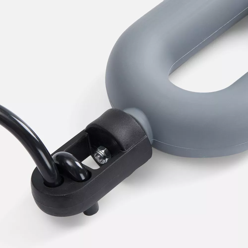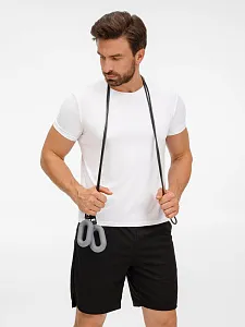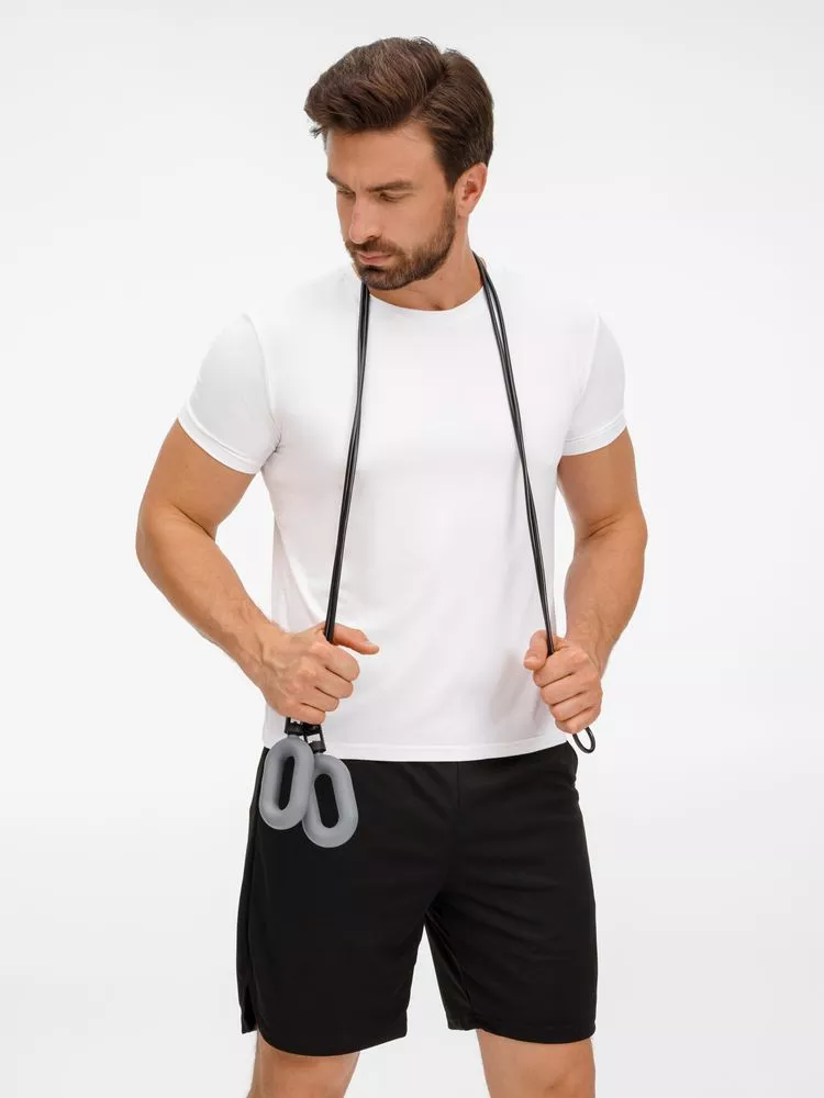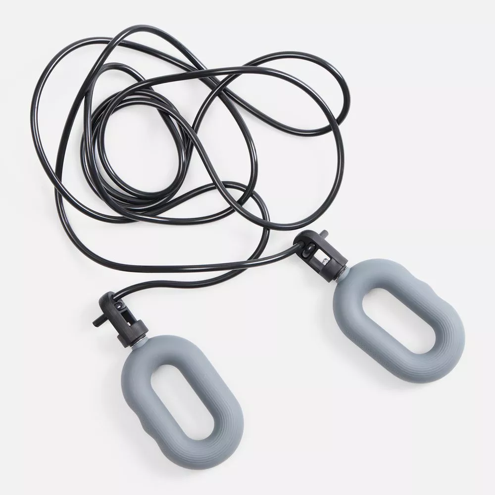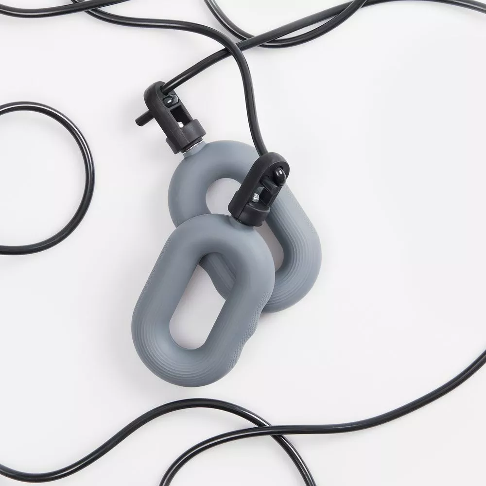 Шнур к ручкам-эспандерам крепится через пластиковый переходник с отверстиями для продевания шнура. Эспандеры выполнены из тактильно приятного силикона, обладающего высокой степенью эластичности и прочности, а широкий шнур (5 мм) из плотного ВПХ.
