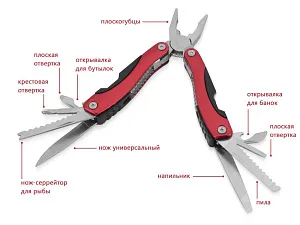 Настоящая находка для всех хозяйственных мужчин. Мультиинструмент всегда будет под рукой, так как его можно носить на поясе. Супер-пассатижи в чехле не так просты, как кажутся на первый взгляд! Они скрывают в себе целый арсенал нужных инструментов! - плоскогубцы - открывалка для бутылок - крестовая отвертка - нож-серрейтор для рыбы - нож универсальный - открывалка для банок - плоская отвертка 2 шт - пила - напильник Гравировка (оптоволоконный лазер) (Без чернения) на данный товар осуществляется бесплатно. Оплачивается только настройка оборудования в размере 1000 рублей на весь тираж.