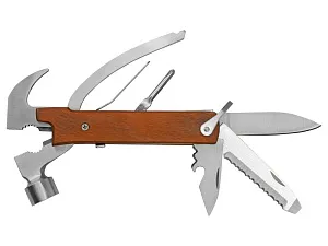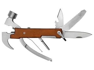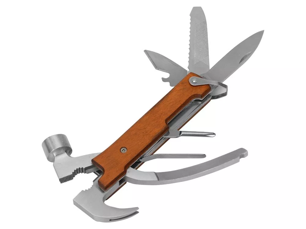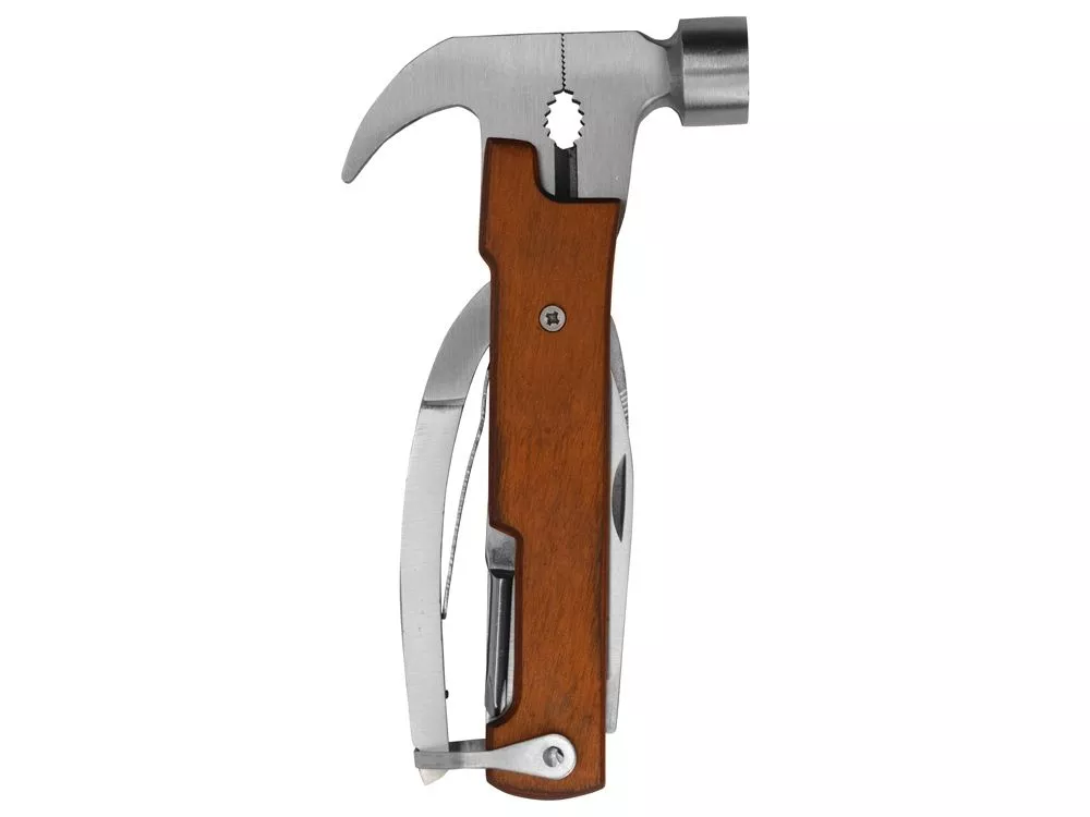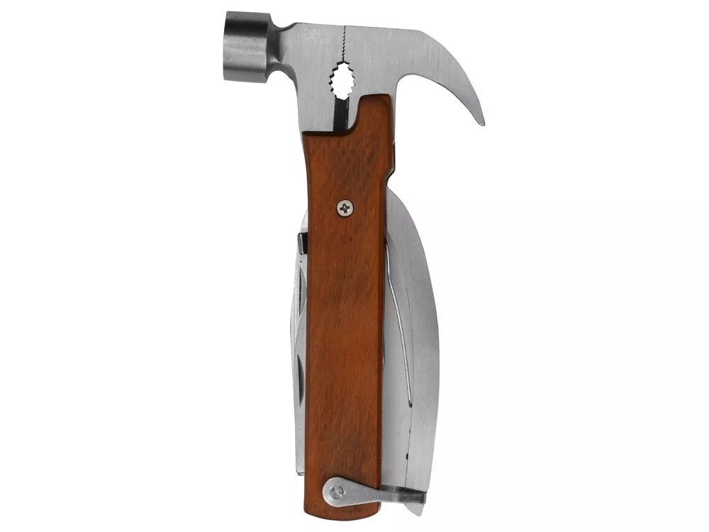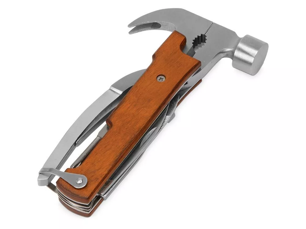 Многофункциональный инструмент, который выручит дома, на даче, в путешествии, походе и во множестве других ситуаций. Полностью сделан из металла и декорирован накладками из натурального дерева. Чехол в комплекте. Основные функции: - Молоток - Плоскогубцы - Гвозодер - Кусачки - Пила - Напильник - Нож - Открывашка - Отвертка (крестовая и плоская) Гравировка (Без чернения) на данный товар осуществляется бесплатно. Оплачивается только настройка оборудования в размере 500 рублей на весь тираж.