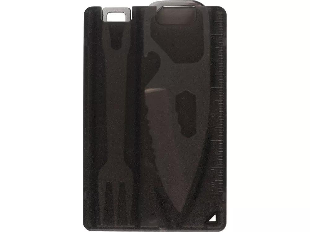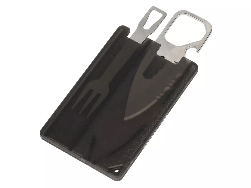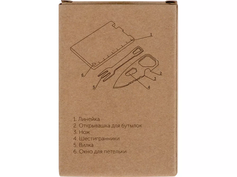 Компактный мультитул в форме карты. - Линейка - Открывашка для бутылок - Нож - Шестигранники - Вилка - Окно для петельки Гравировка (оптоволоконный лазер) (Без чернения) на данный товар осуществляется бесплатно. Оплачивается только настройка оборудования в размере 950 рублей на весь тираж.