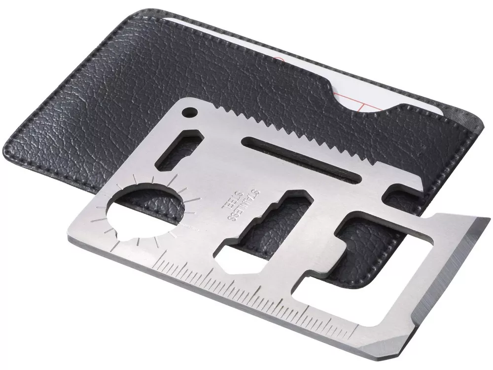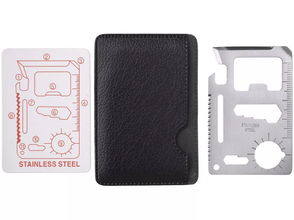 Многофункциональная карта. 15 функций в одной карте - нож, консервный нож, отвертка, линейка, открывалка, 2-х и 4-х позиционный гаечный ключ, разводной гаечный ключ, режущий диск, брелок, указатель направления. Чехол из кожзаменителя.