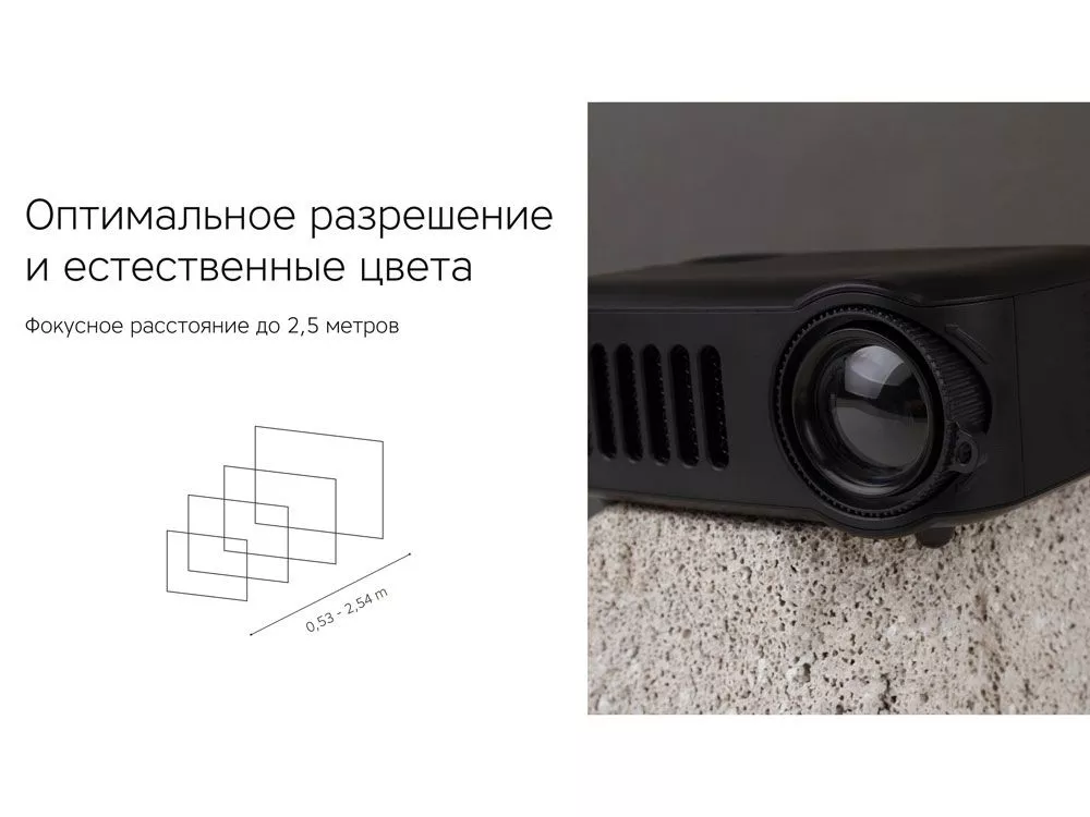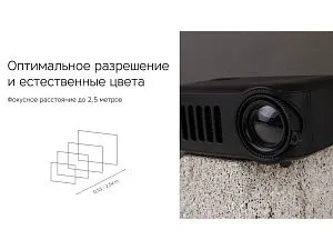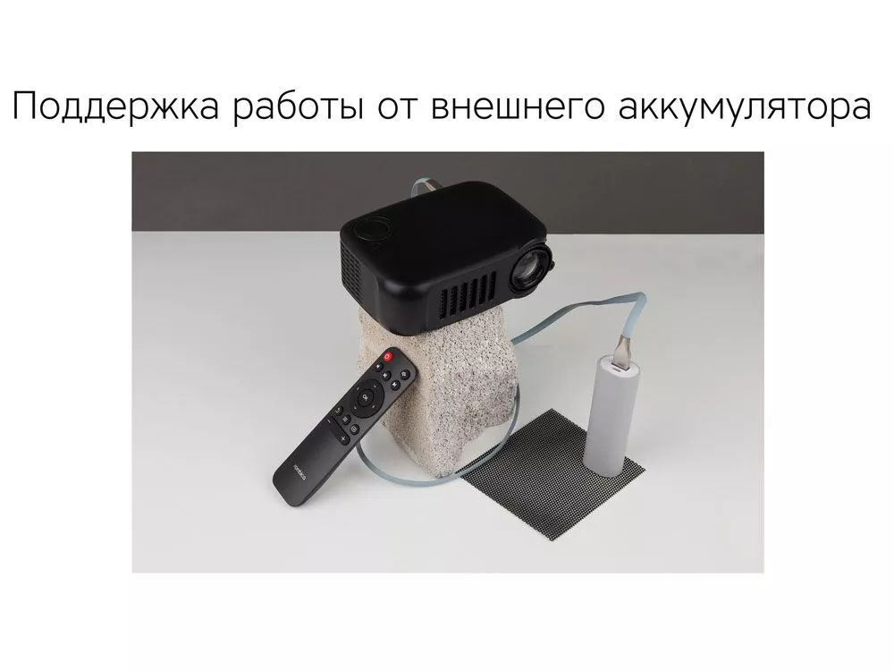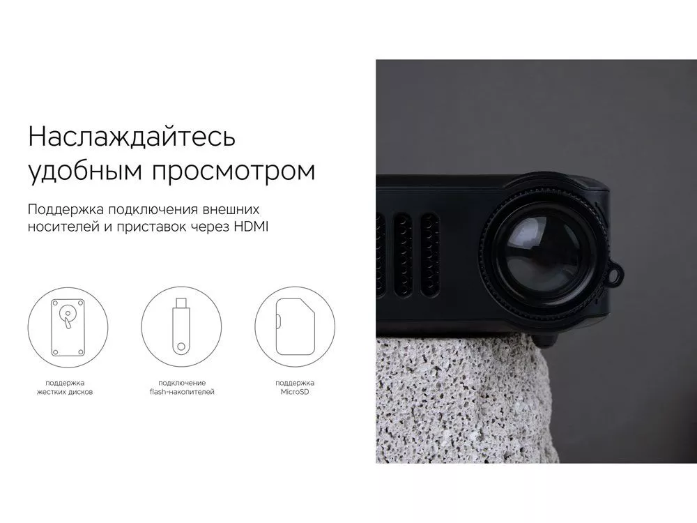 • Портативный проектор. Работает от сети или аккумулятора • microSD и USB. Поддержка популярных форматов мультимедиа • 30 000 часов. Срок службы LED-лампы • Встроенный динамик