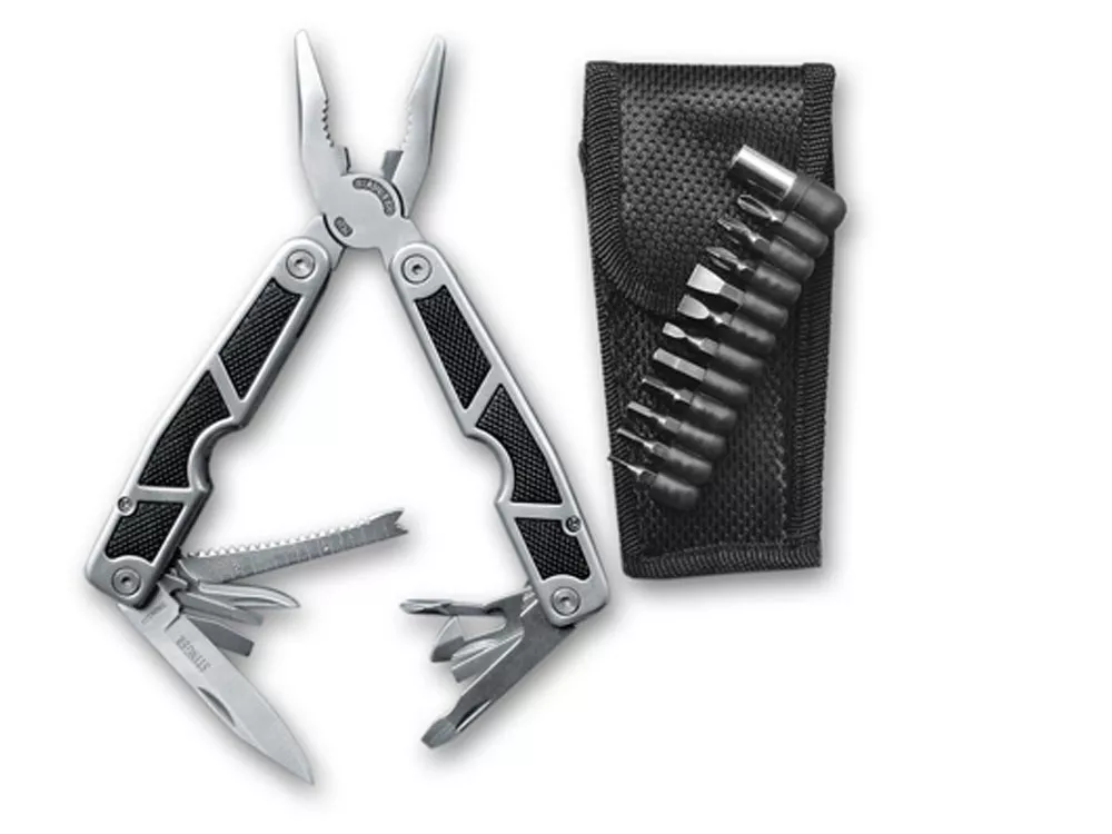 МНОГОФУНКЦИОНАЛЬНЫЙ ИНСТРУМЕНТ STINGER С НАБОРОМ ИЗ 10 ФУНКЦИЙ: 1. Плоскогубцы 2. Лезвие большое плоское 3. Лезвие малое 3. Напильник по дереву и металлу 4. Открывалка для бутылок и консерв 5. Пила 6. Линейка 7. Отвёртка крестовая 8. Шило 9. Инструмент для снятия изоляции 10. Набор из 11 бит с переходником ХАРАКТЕРИСТИКИ: Материал инструментов: нержавеющая сталь Материал рукояти: алюминий, каучук Длина: 115 мм Ширина: 45 мм Вес: 392 г В комплекте: чехол из синтетического материала Упаковка: складная картонная коробка