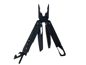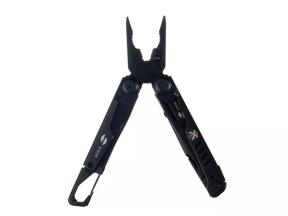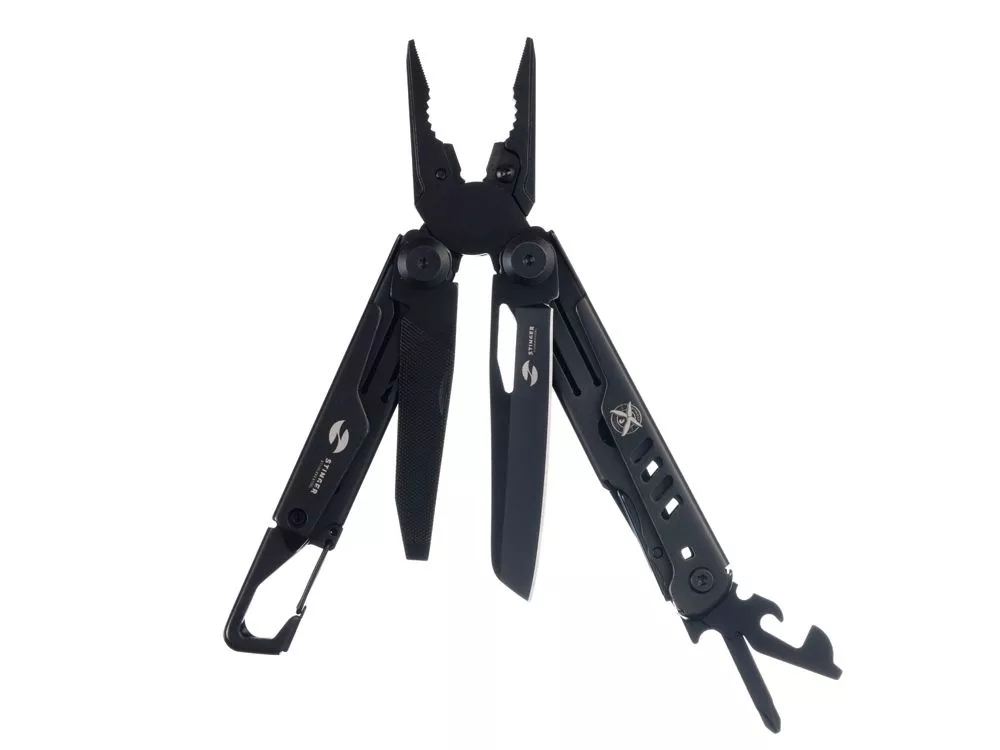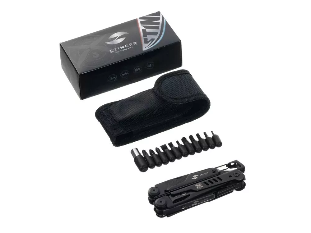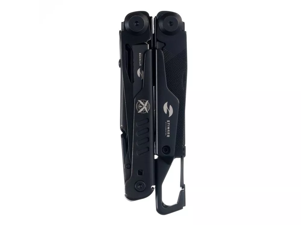 МНОГОФУНКЦИОНАЛЬНЫЙ ИНСТРУМЕНТ STINGER С НАБОРОМ ИЗ 14 ФУНКЦИЙ 1. Острогубцы 2. Плоскогубцы 3. Кусачки 4. Лезвие с фиксатором клинка 5. Ножницы 6. Напильник по металлу 7. Линейка 8. Пила по дереву 9. Консервный нож с: 10. – Мини-плоской отверткой 11. - Открывалкой для бутылок 12. Крестовая отвертка 13. Инструмент для снятия изоляции 14. Карабин ХАРАКТЕРИСТИКИ Материалы • лезвие/инструменты: нержавеющая сталь 440A, твердость 54-58 HRC • рукоять: нержавеющая сталь 440A, твердость 54-58 HRC Размеры • Размеры мультитула: 115х38х19 мм • Общая длина: 193,6 мм • Длина клинка: 78,2 мм • Наибольшая ширина клинка: 17,1 мм • Толщина обуха: 2,6 мм • Длина рукояти: 115 мм • Ширина рукояти (в ср.части): 36,9 мм • Толщина рукояти (в ср.части): 19,6 мм Вес: 239 г Цвет: черный Комплектация: адаптер для бит, набор из 11 бит, нейлоновый чехол Упаковка: картонная коробка