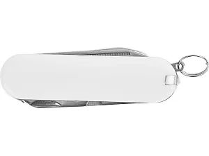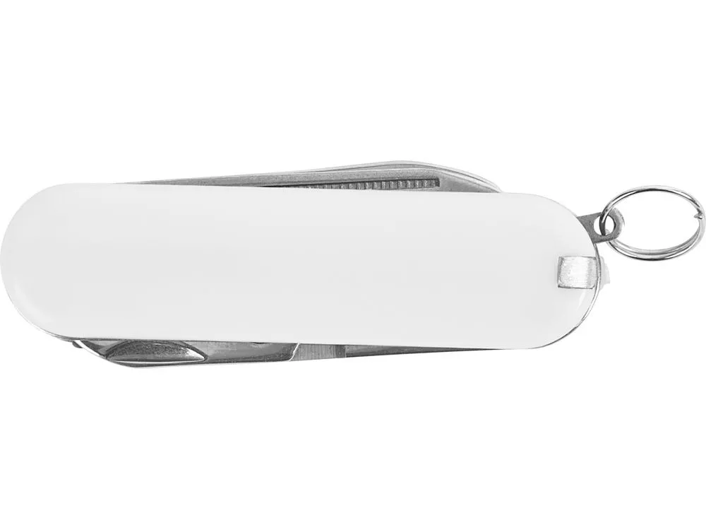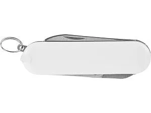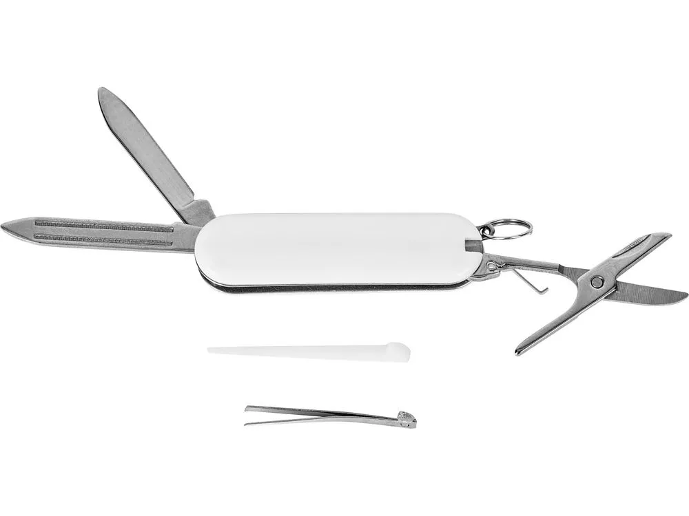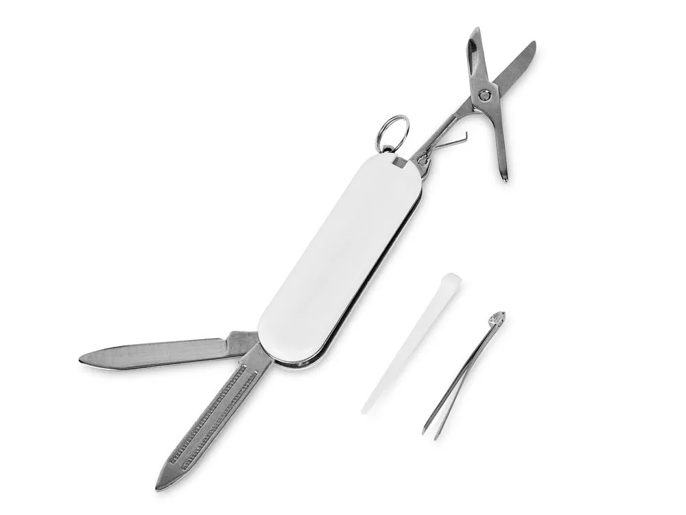 Складной нож в пластиковом глянцевом корпусе. Можно удобно прикрепить на ключницу. В комплект входят: - Ножницы - Нож - Пилочка - Щипцы - Шило Тампопечать (1 цвет (белые изделия)) на данный товар осуществляется бесплатно. Оплачивается только настройка оборудования в размере 4000 рублей на весь тираж.