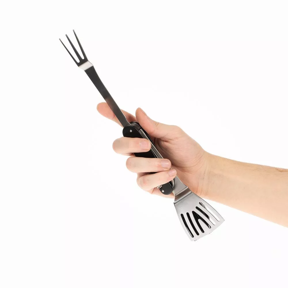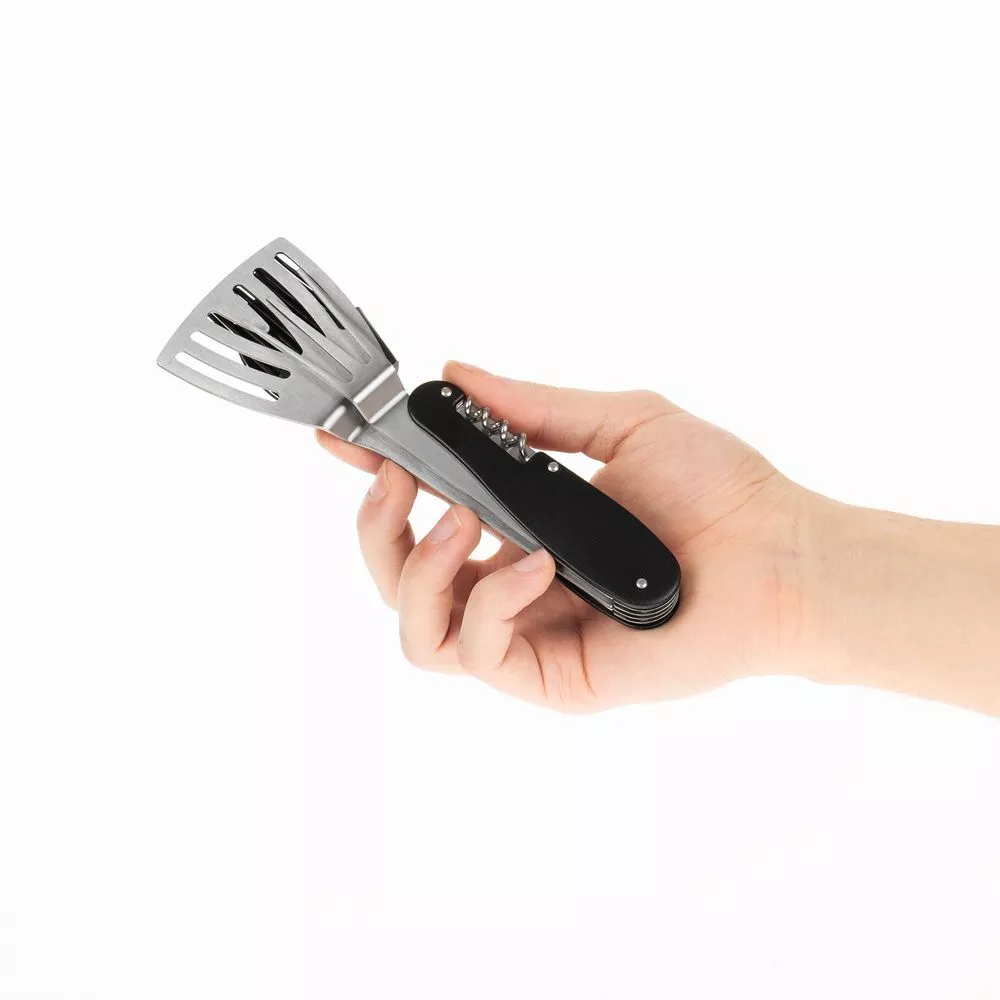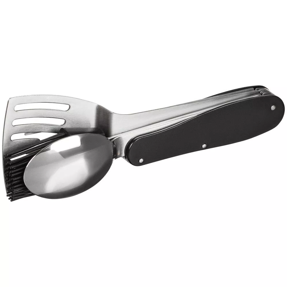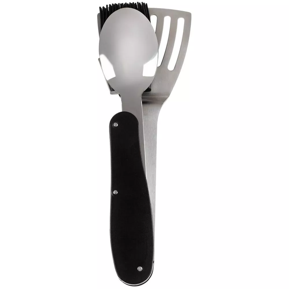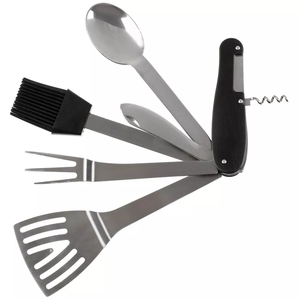 В одном инструменте объединены шесть функций: лопатка, ложка, кулинарная кисть, вилка, нож и штопор. Это позволяет легко выполнять все основные задачи во время барбекю с максимальным удобством.
