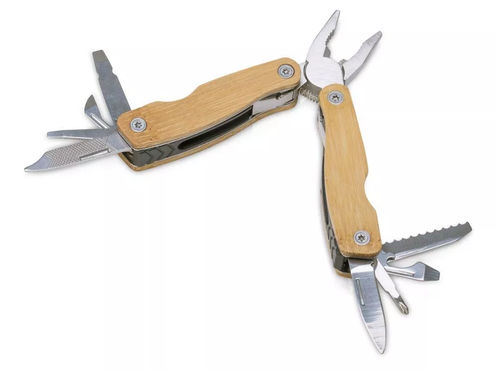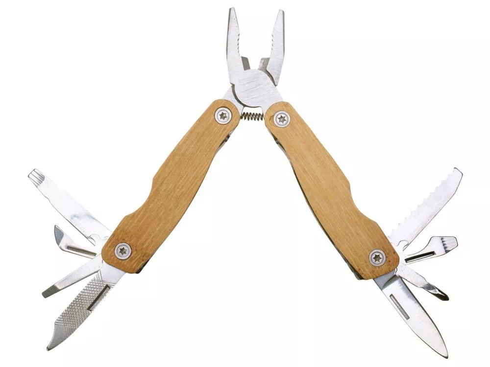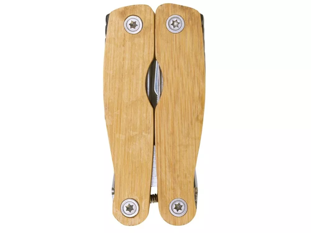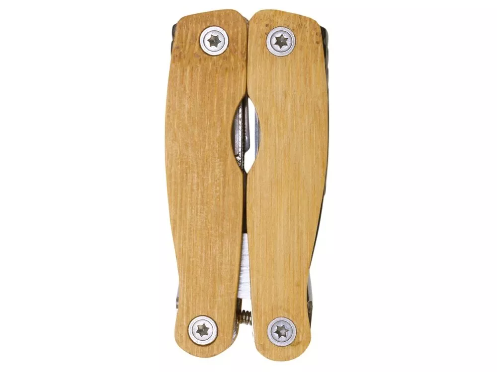 Компактный мультитул на каждый день с корпусом из бамбука. Поставляется в коробочке с чехлом. - плоскогубцы - открывалка для бутылок - крестовая отвертка - нож универсальный - открывалка для банок - плоская отвертка 3 шт. - пила по дереву - напильники по дереву и металлу Гравировка (CO2 лазер) (Без чернения) на данный товар осуществляется бесплатно. Оплачивается только настройка оборудования в размере 1100 рублей на весь тираж.