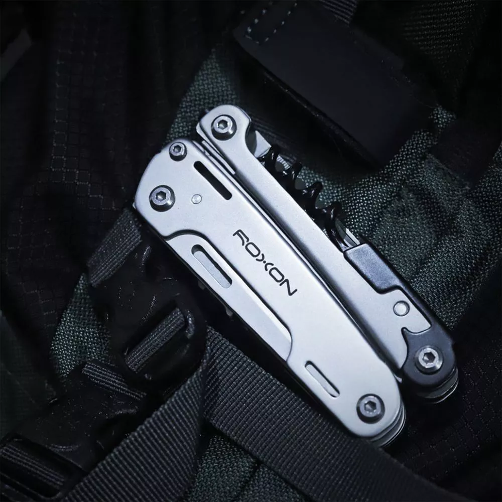 В комплекте мультитул, чехол и набор из 10 съемных бит.