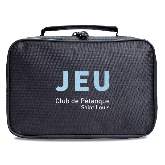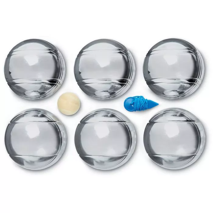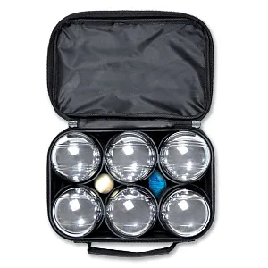 Игровые мячи изготовлены из металла. 6 штук. Чехол из полиэстера 600В на молнии. Диаметр мяча 7,3 см, вес набора 730 гр.