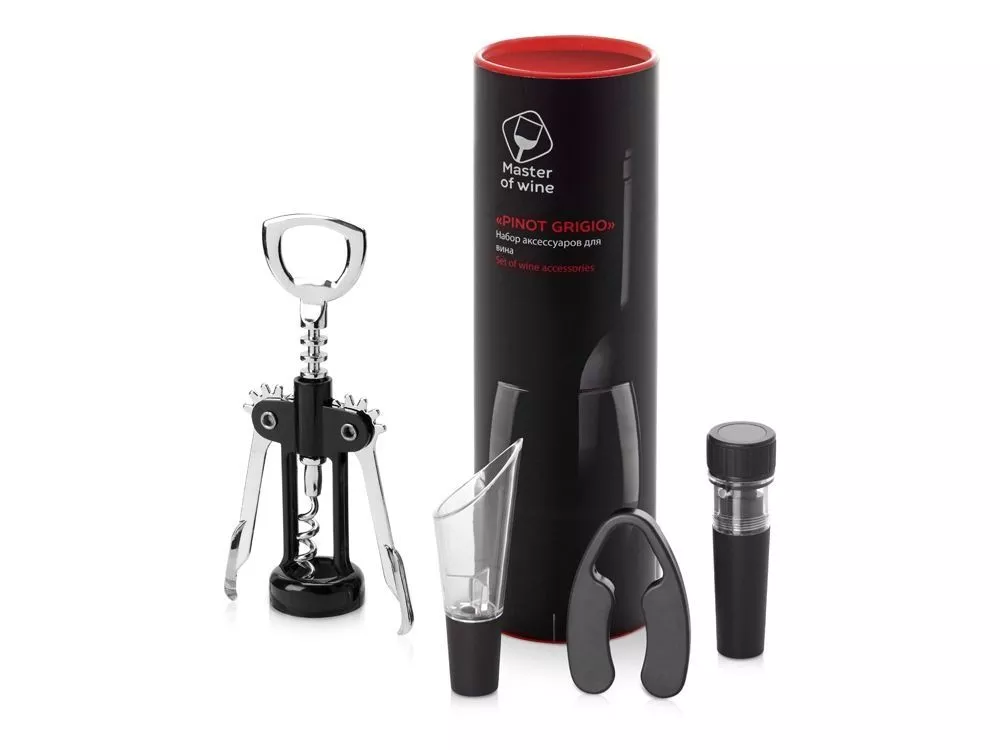 В винном наборе Pinot Grigio собрано все, что необходимо для откупоривания, подачи и длительного хранения вина. Аксессуары поставляются в эффектном красном тубусе и брендированном шубере. В состав комплекта входят: · механический штопор, который позволяет быстро откупорить бутылку и извлечь пробку без каких-либо повреждений; · вакуумная пробка, продлевающая срок хранения вина; · аэратор для переливания вина из бутылки в бокал и насыщения кислородом; · нож для срезания фольги. Набор аксессуаров станет функциональным и стильным подарком, который понравится ценителям благородных напитков. Тампопечать (1 цвет (цветные изделия)) на данный товар осуществляется бесплатно. Оплачивается только настройка оборудования в размере 8200 рублей на весь тираж.