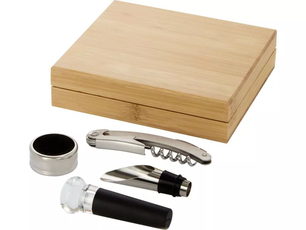 Набор для вина из 4 предметов: штопор, пробка, насадка на бутылку и кольцо. Поставляется в бамбуковой подарочной коробке, изготовленной в соответствии с экологическими стандартами.