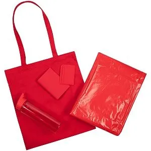 Большая спортивная бутылка для поддержания водного баланса, стильные личные аксессуары на каждый день и конечно, необходимый атрибут выездных мероприятий — плотный пластиковый дождевик-плащ с капюшоном. Все это собрано в идеальной упаковке — базовом тонком шопере, который может пригодиться на мастер-классе по рисованию на ткани.