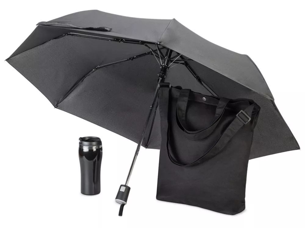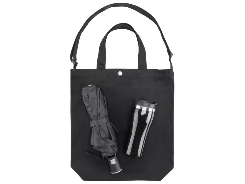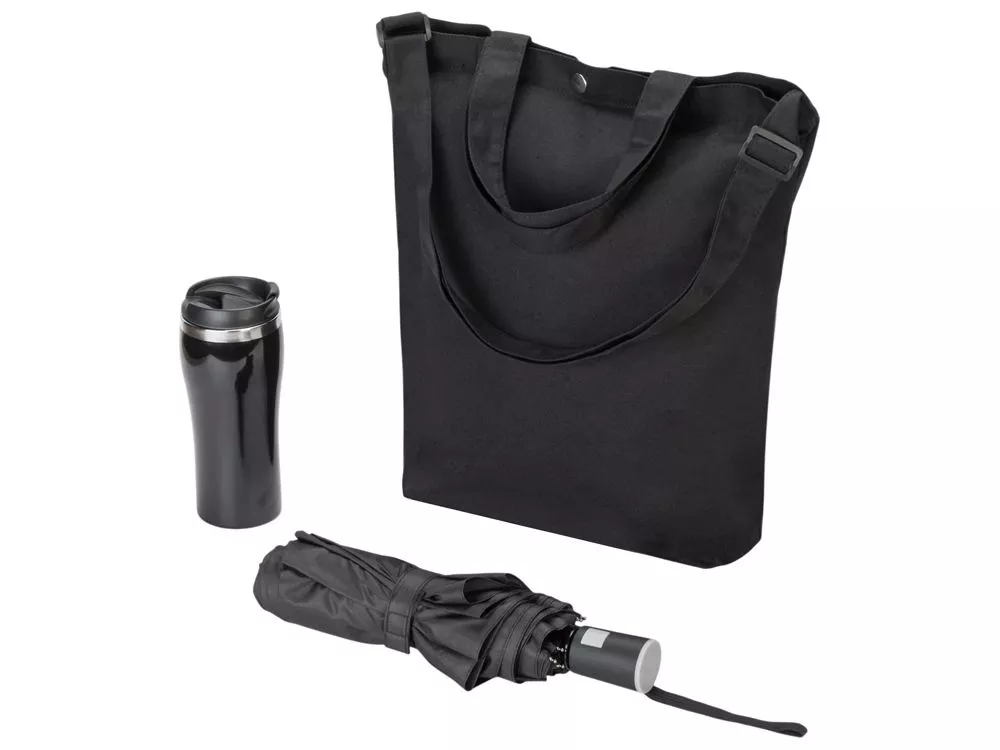 Набор для прогулок и шоппинга в любую погоду. На случай дождя предусмотрен зонт. Если на улице холодно, можно налить в кружку любимый согревающий напиток, а вместительная удобная сумка выдержит вес множества покупок. Сумку можно нести в руке или на плече для вашего удобства. Трафаретная печать (1 цвет (цветные изделия)) на данный товар осуществляется бесплатно. Оплачивается только настройка оборудования в размере 10000 рублей на весь тираж.