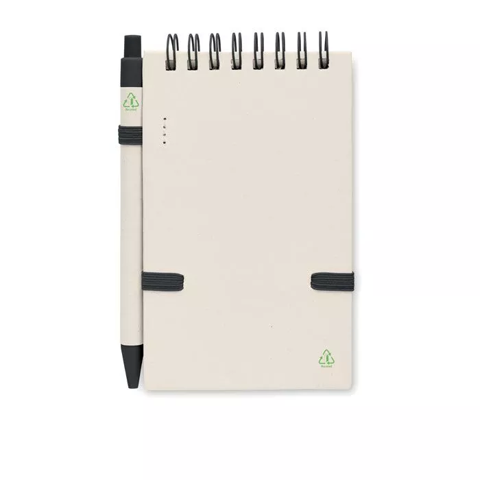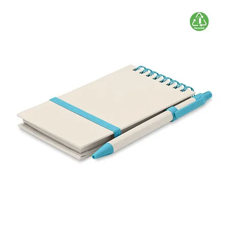 Блокнот A6 из переработанного пакета молока 70 листов из переработанной обычной бумаги (70% переработанного пакета молока и 30% переработанной бумаги) с подходящей ручкой. Скреплен кольцом. Соответствующая шариковая ручка с кнопкой. Синие чернила. Эластичный ремешок и держатель для ручки.