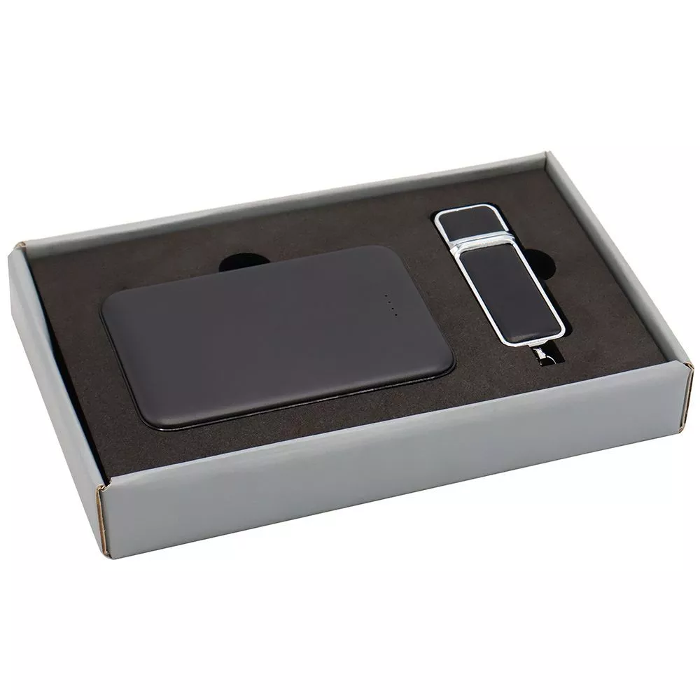 Подарочный набор в стильной цветной картонной коробке серого цвета с конструкцией крышка-дно. Внутри на аккуратном ложементе расположены внешний аккумулятор емкостью 5 000 mAh и элегантная флешка объемом 16 ГБ в корпусе с вставками из искусственной кожи. Мощный аккумулятор обеспечивает быстрое и надежное питание мобильных устройств, а флешка в изысканном дизайне сочетает вместительность с темой премиального стиля, надежно сохраняя ваши цифровые файлы. Такой набор станет стильным и практичным подарком для деловых и активных людей, ценящих качество и эстетичность.