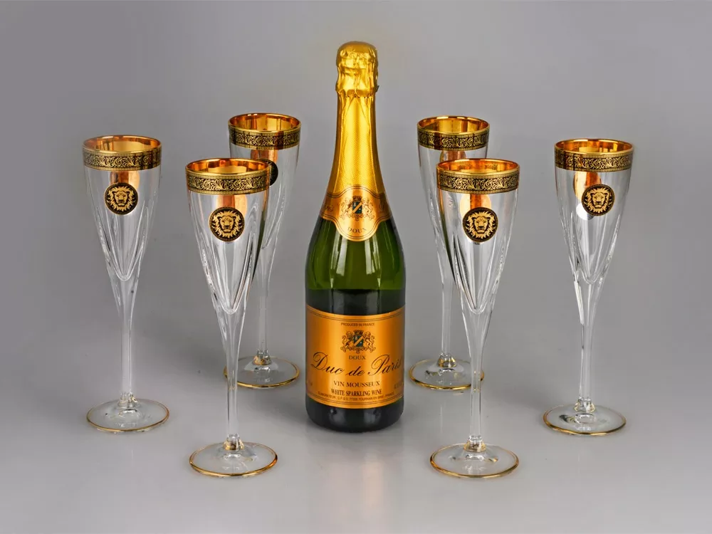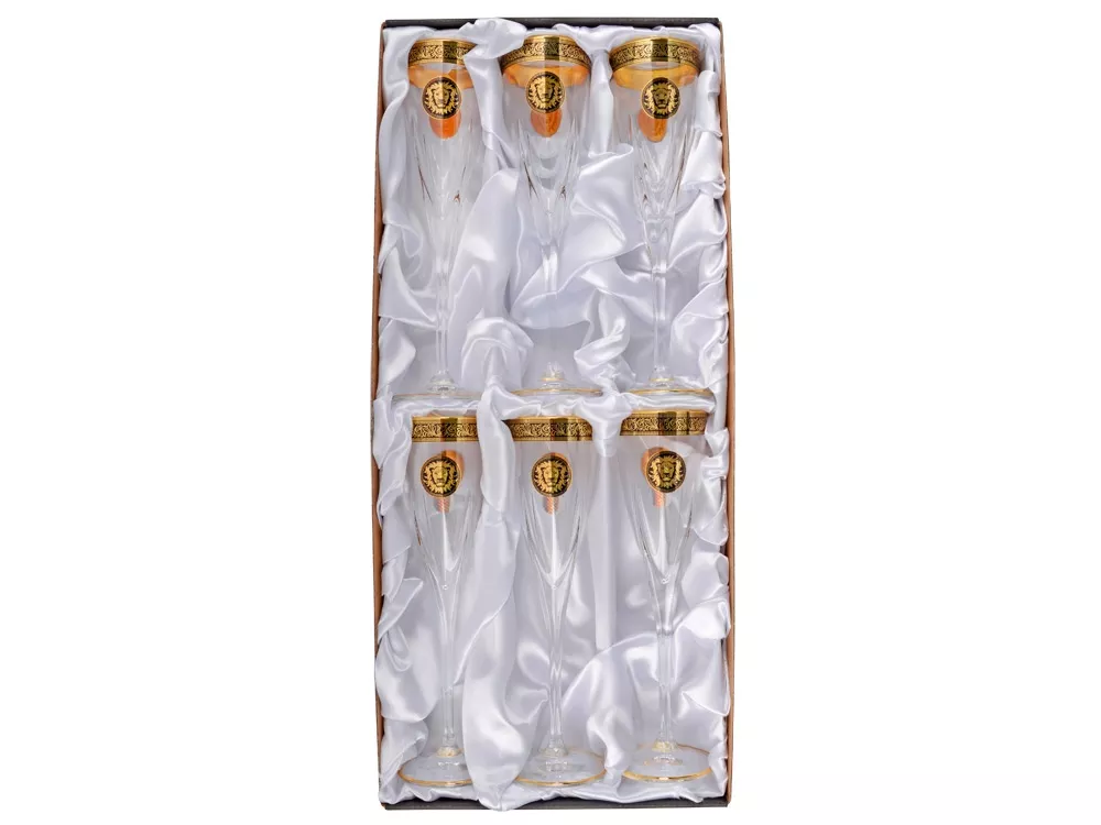 Оригинальный набор бокалов для шампанского, задекорированных золотистым изображением царя зверей – могучего льва. Бокалы выполнены из прозрачного хрусталя с золотистой отделкой по краю и на ножке. Набор рассчитан на 6 персон.