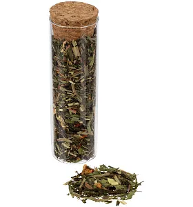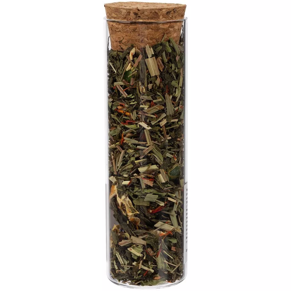 - чай зеленый ароматизированный «Хорошее настроение» (состав: зеленый чай сенча, лимонная трава, календула, мята, сушеное яблоко, сушеный апельсин, сушеная клубника, ароматизатор «лайм», ароматизатор «мята»), вес 22 г.