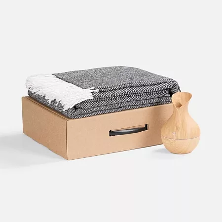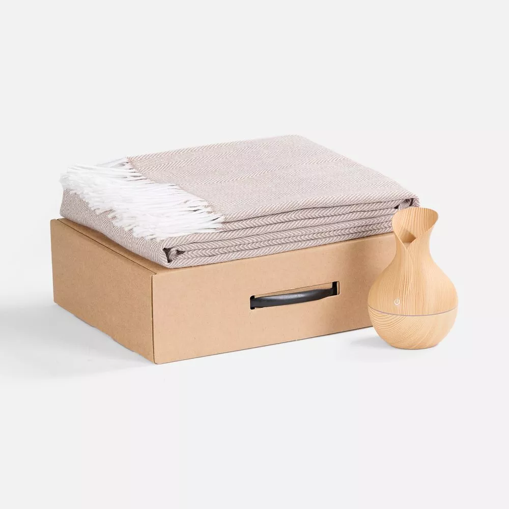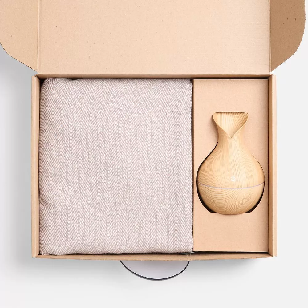 Мягкий плед нежных оттенков подарит тепло и комфорт, а изящный увлажнитель наполнит воздух свежестью и приятным ароматом. Этот набор — гармония красоты и функциональности, которая превращает каждый момент в отдых и восстановление.