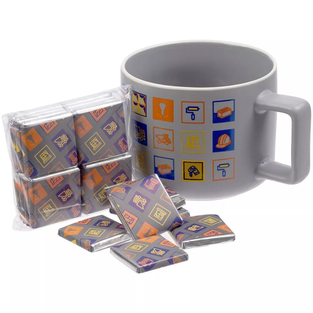 Работа в строительной отрасли — это целый калейдоскоп событий и важных, трудоемких задач. Для достижения высоких результатов необходимо уделять внимание каждому этапу работы. И особенно перерыву! Набор Industry с большой кружкой и плитками горького шоколада — идеальное решение для корпоративного подарка работникам сферы строительства.