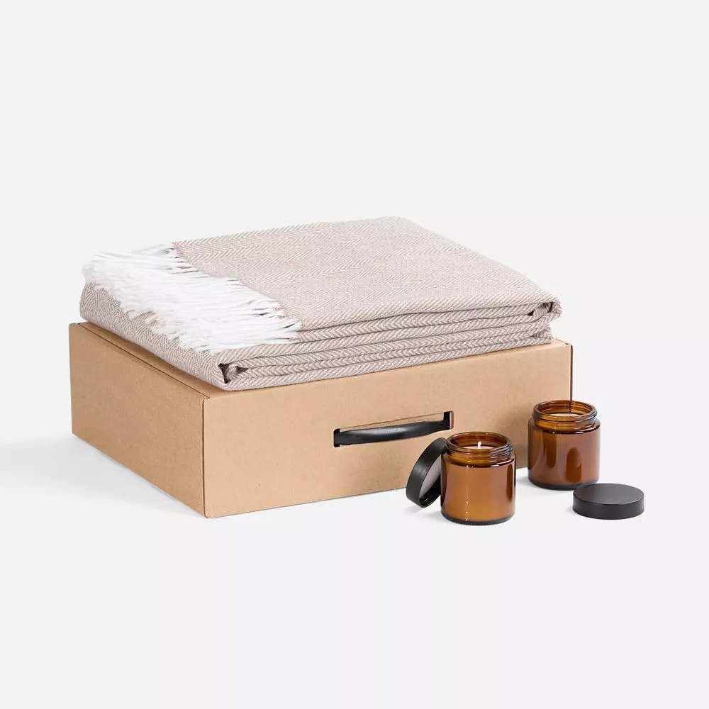 Мягкий плед с нежной бахромой станет идеальным спутником для расслабляющих вечеров, создавая комфорт и стильный облик в любом интерьере. Две ароматические свечи в элегантных стеклянных баночках наполнят пространство расслабляющим мягким светом и тонким ароматом, добавляя нотки спокойствия и гармонии.