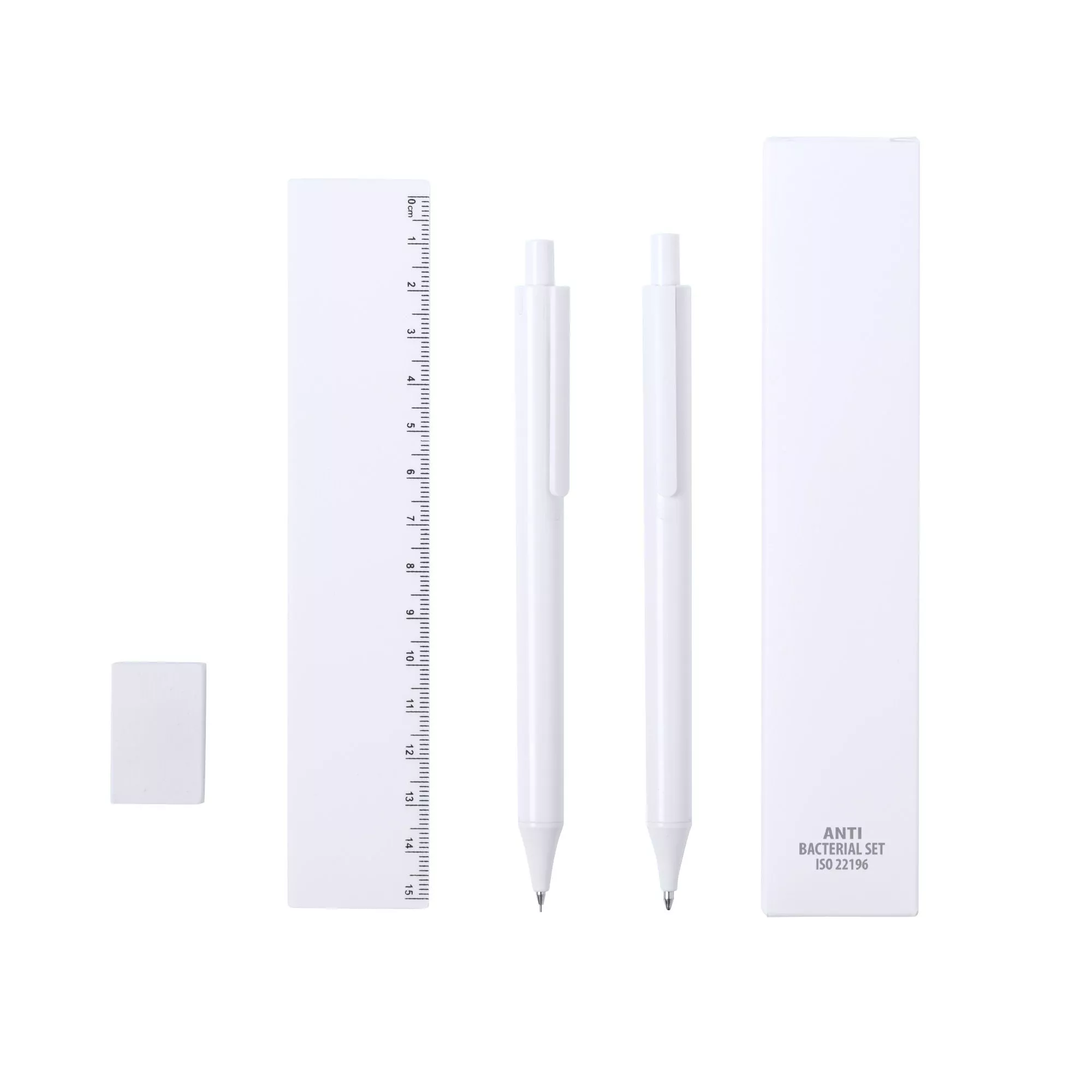 Антибактериальный набор включает ручку, механический карандаш (грифель 0,5 мм в комплекте), линейку на 15 см и ластик. Благодаря добавлению высокоэффективных противомикробных агентов достигается резкое снижение уровня бактерий, присутствующих на поверхностях материалов. Изделие соответствует стандарту ISO 22196, который определяет антибактериальную активность пластмасс и непористых поверхностей.