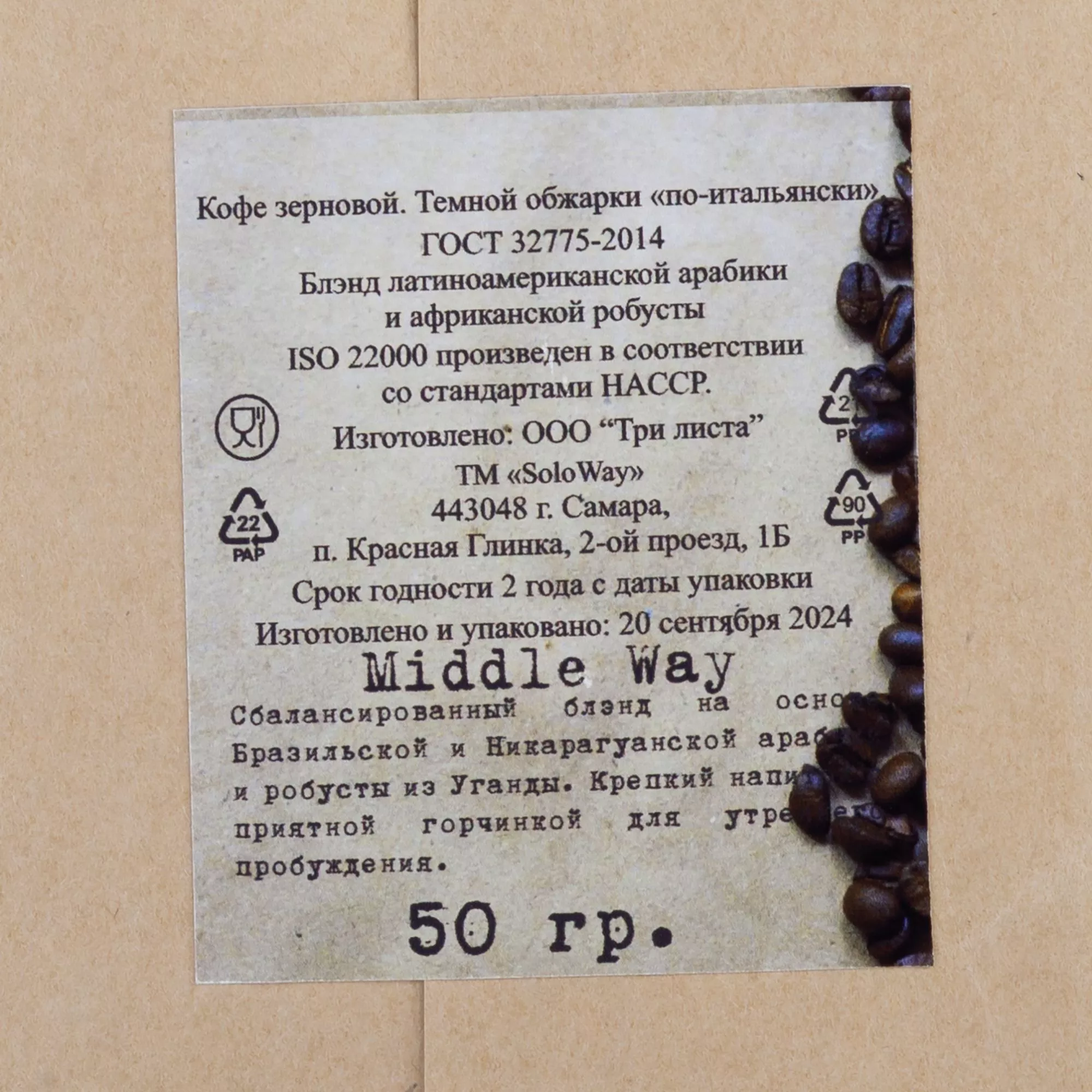 - кофе зерновой (арабика+робуста 50/50) 50 гр;