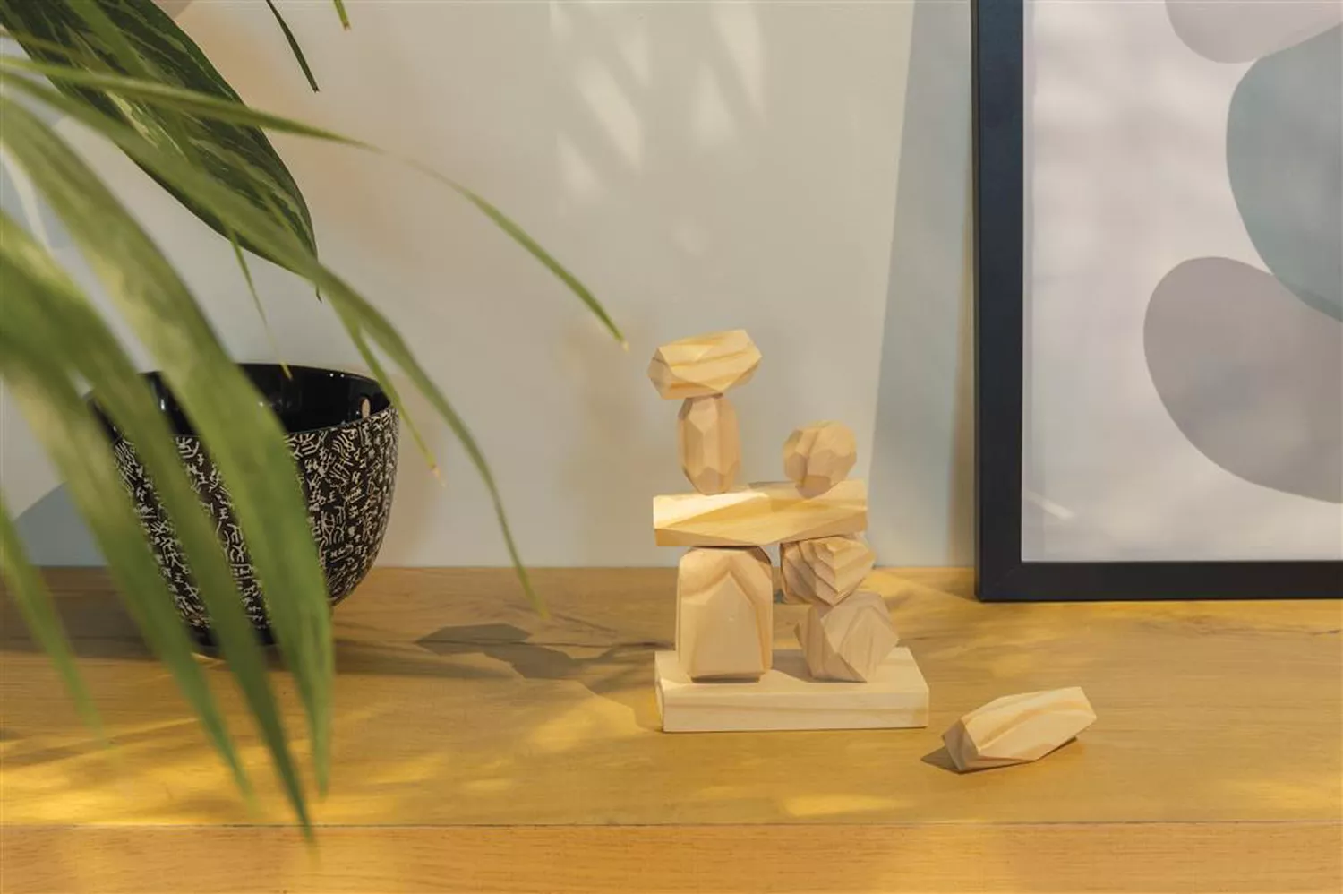 Камни изготовлены из древесины сосны и хорошо отшлифованы — они очень приятные на ощупь и ароматные. Натуральная древесина всегда выигрышно смотрится практически в любом интерьере, а благодаря множеству вариантов сборки набор Crios станет универсальным декором комнаты.
