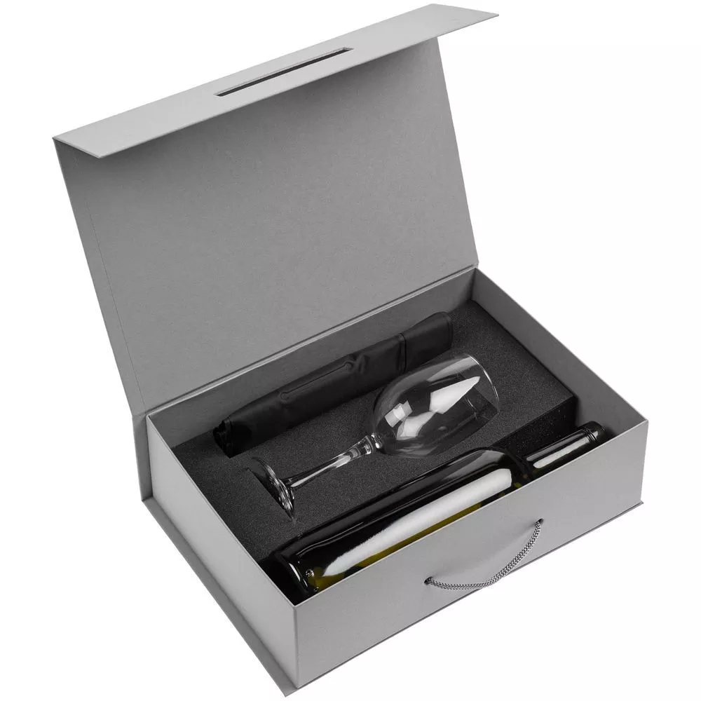 Бокал и охлаждающий рукав для бутылки — важные инструменты для правильной подачи вина. А вино можно выбрать на свой вкус: в коробке специально оставлено место для бутылки любимого алкогольного напитка.