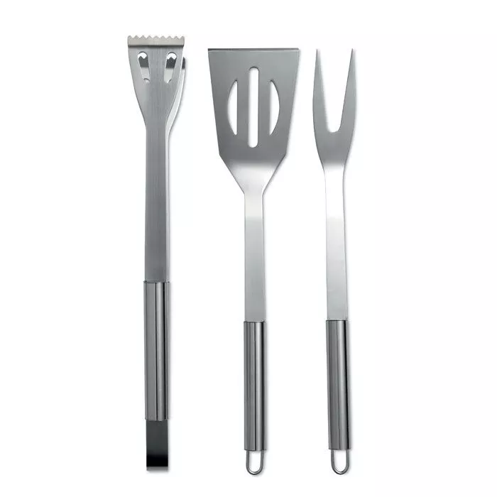 Инструменты для барбекю из нержавеющей стали в черном чехле из нетканого материала.