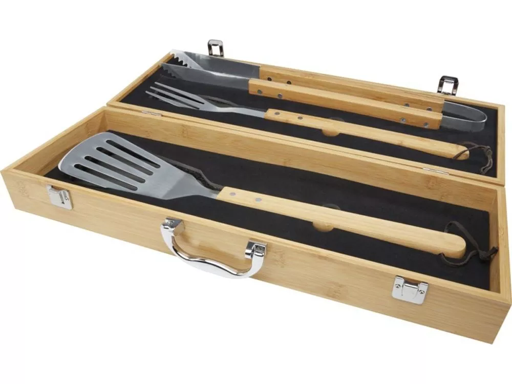 Набор для барбекю из 3 предметов из бамбука: лопатка (42 x 9,5 см), щипцы (46 x 2,2 см) и вилка (43 x 3,2 см). Набор поставляется в подарочной коробке из бамбука (51,5 x 18,2 x 7,2 см). Ручки и подарочная коробка изготовлены из бамбука, который производится в соответствии со стандартами устойчивого развития.
