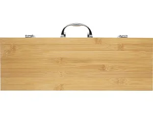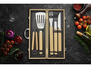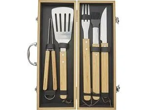 Набор для барбекю из 5 предметов из бамбука: лопатка (40 x 9,5 см), щипцы (34,5 x 6 см), вилка (38,5 x 3 см), нож (38,5 x 3 см) и щетка (38 x 4,3 см). Набор поставляется в подарочной коробке из бамбука (46 x 16,2 x 7,4 см). Ручки и подарочная коробка изготовлены из бамбука, который производится в соответствии со стандартами устойчивого развития.