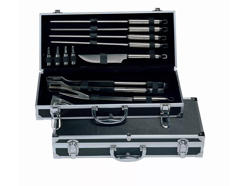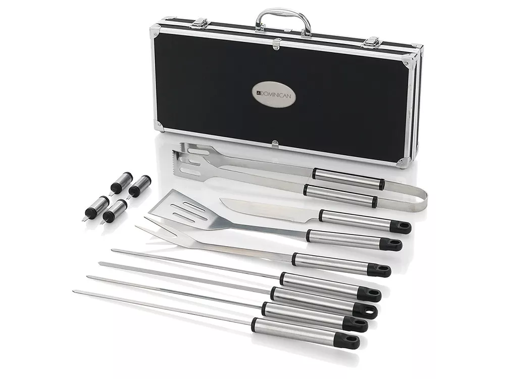 Набор для барбекю 12 предметов. 4 шампура, 4 шпажки для снятия шашлыка, нож для мяса, щипцы, вилка, лопатка. Шильд в комплекте.