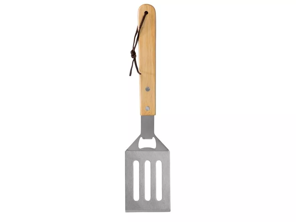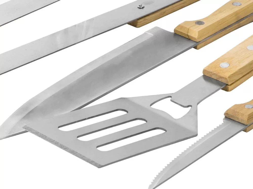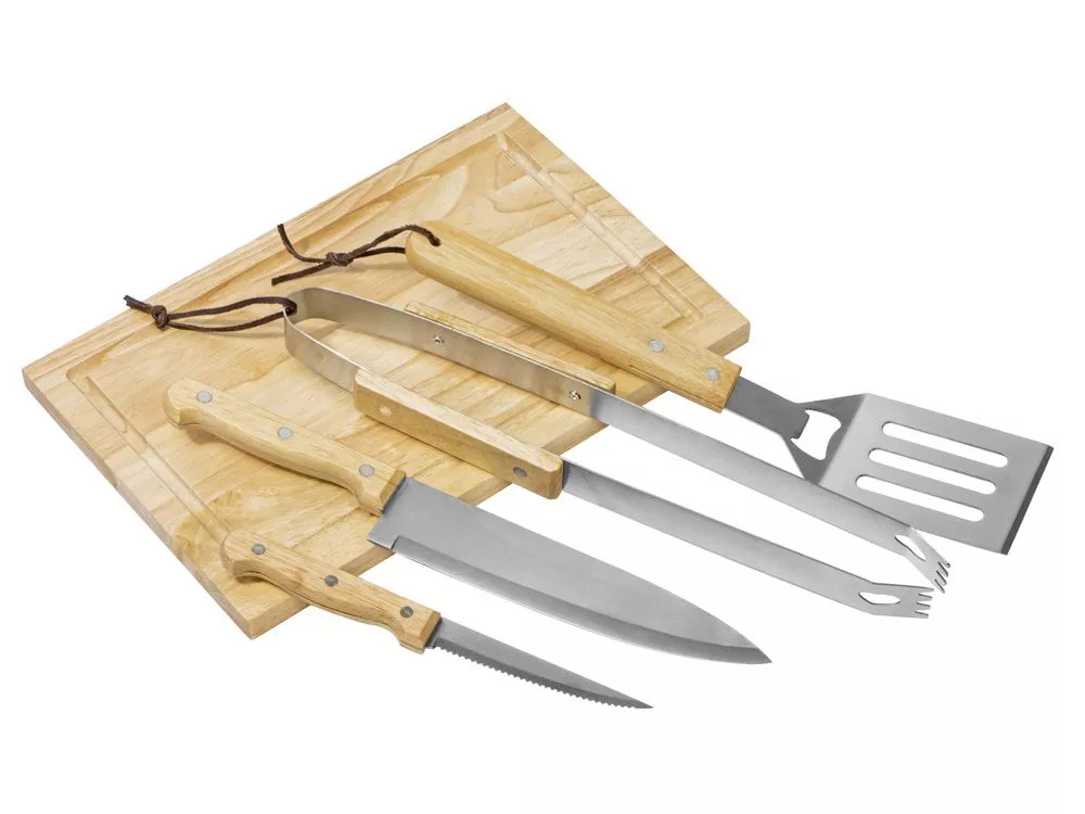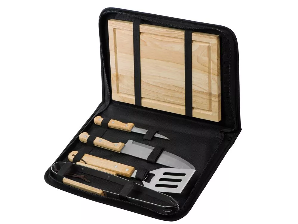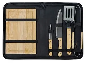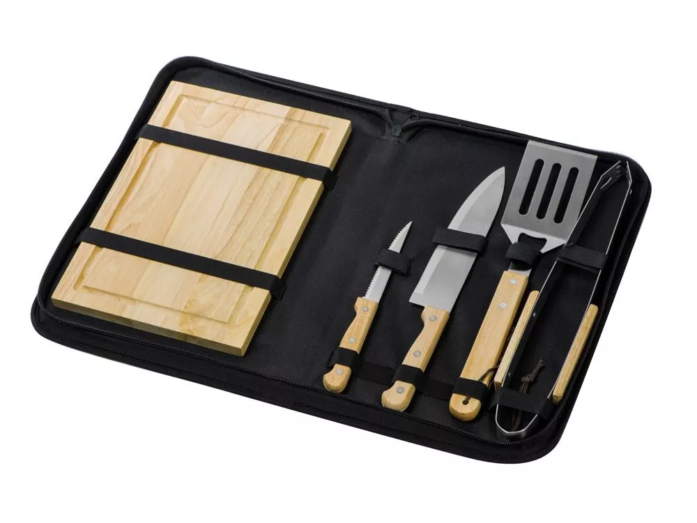 Набор из шести приспособлений для барбекю и гриля - в состав входят разделочная доска, щипцы, лопатка, нож для стейка, нож большой, а упаковывается сет в чехол из полиэстера. Благодаря длинным ручкам из каучукового дерева лопатку, ножи и щипцы удобно держать, не боясь горячих брызг при готовке. Деревянные ручки не нагреваются, что особенно ценно во время BBQ. - приспособления для всех этапов приготовления барбекю и гриля - деревянные длинные ручки не нагреваются и не скользят - нержавеющая сталь, каучуковое дерево - чехол для хранения из полиэстера Гравировка (оптоволоконный лазер) (Без чернения) на данный товар осуществляется бесплатно. Оплачивается только настройка оборудования в размере 950 рублей на весь тираж.