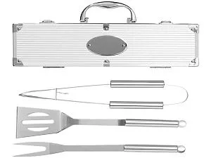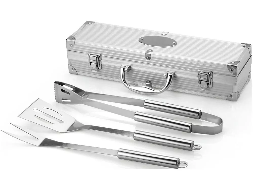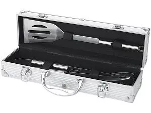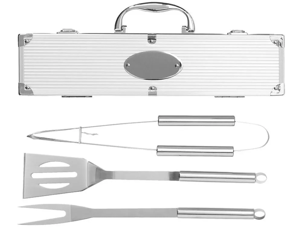 Набор для барбекю 3 предмета. Лопатка, щипцы и вилка в кейсе. На алюминиевом кейсе имеется шильд для персонализации. Гравировка (оптоволоконный лазер) (Без чернения) на данный товар осуществляется бесплатно. Оплачивается только настройка оборудования в размере 1000 рублей на весь тираж.